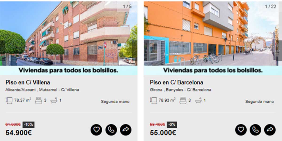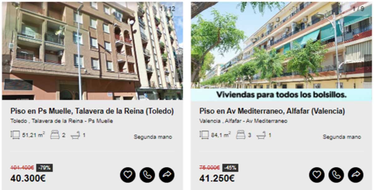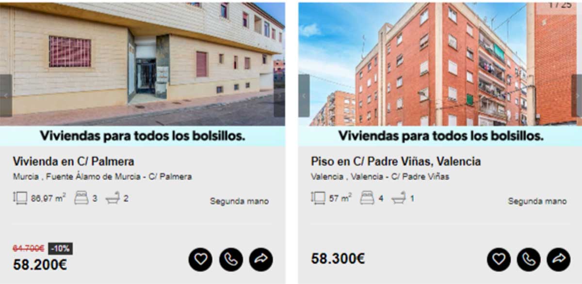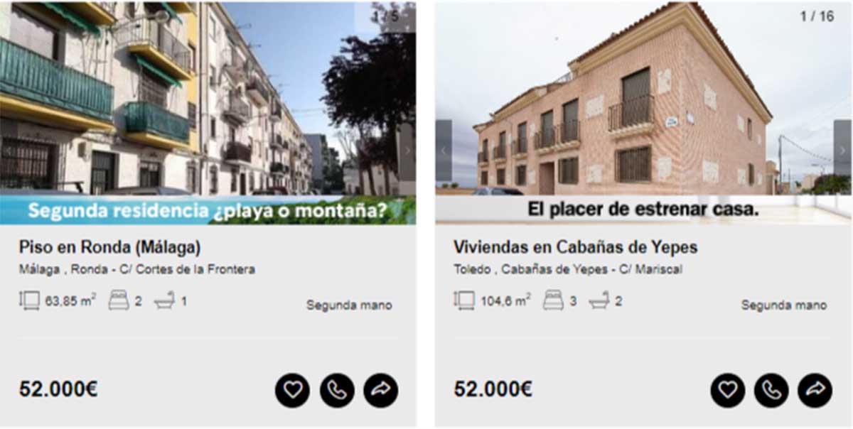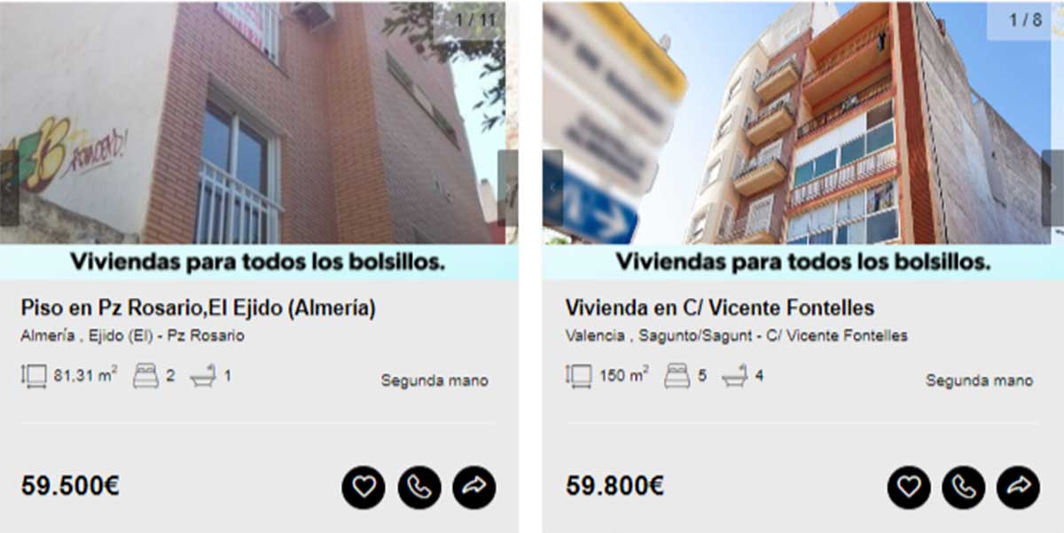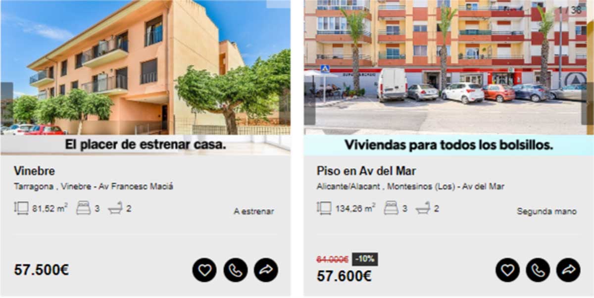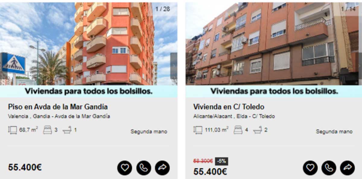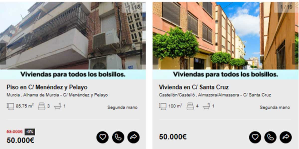 Se trata de inmuebles tanto de segunda mano, como a estrenar y distribuidos por diferentes zonas de España. Aunque la oferta se concentra en algunas provincias del litoral mediterráneo, como Valencia, Murcia y Alicante y en zonas de interior, como Toledo y Ciudad Real.