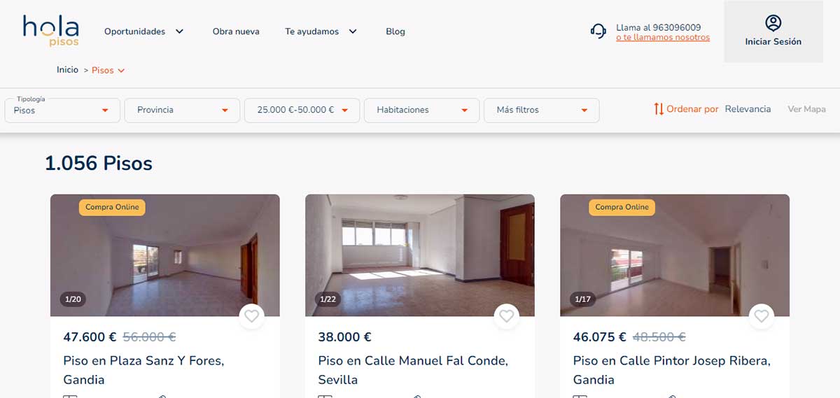 Más de 1.000 viviendas por menos de 50.000 euros. Este es el catálogo disponible de pisos procedentes de bancos a la venta que tiene Holapisos para vender. Las viviendas se encuentran distribuidas por distintos puntos de España, desde provincias de costa hasta en el interior.