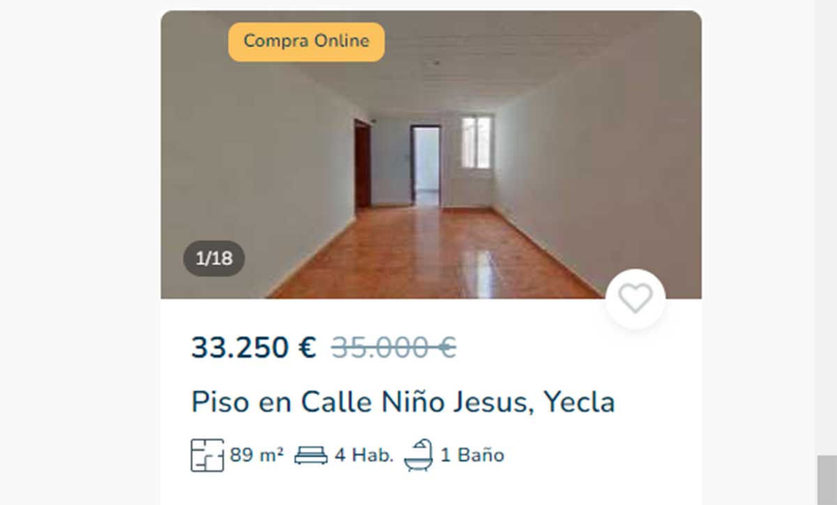 - Por 33.250 euros se vende un piso en Yecla, Murcia. Tiene 9 metros cuadrados distribuidos en cuatro habitaciones y un baño.