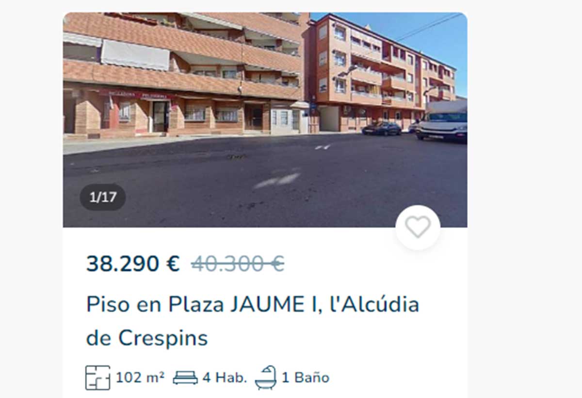 - Piso en venta por 38.290 euros en la localidad de L’Alcúdia de Crespins. Tiene 102 metros cuadrados distribuidos en cuatro habitaciones y un baño.
