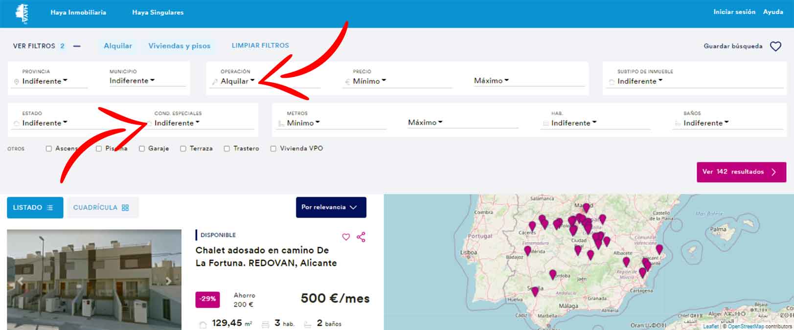Tras desplegarse la sección de los filtros, tienes que asegurarte de que en el apartado ‘Operación’ pone alquiler y que en el apartado ‘Condiciones especiales’ aparezca indiferente. En la siguiente imagen puedes ver señalados los dos apartados a los que nos referimos.
