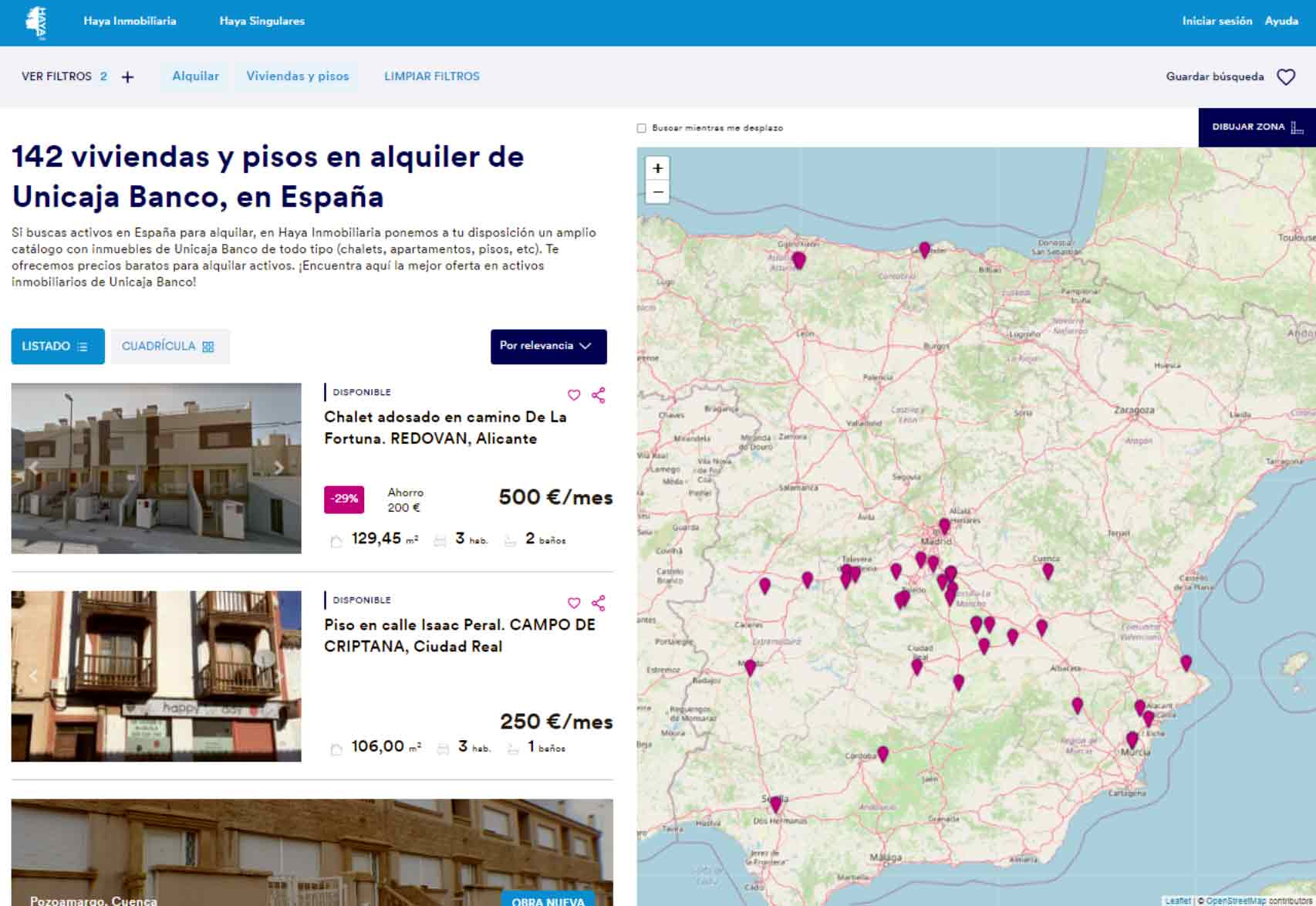En el siguiente mapa puedes observar la distribución de los pisos en alquiler de Unicaja Banco que están disponibles por toda España: