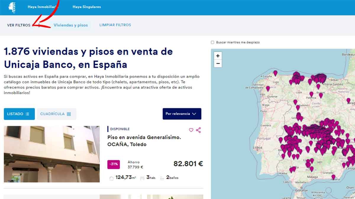 Tal y como ves en la imagen, aparecen un total de 1.867 viviendas disponibles, tanto en venta como en alquiler. Si quieres acceder únicamente al catálogo de pisos para alquilar, tienes que seleccionar la pestaña que se encuentra arriba a la izquierda que dice ‘Ver filtros’.