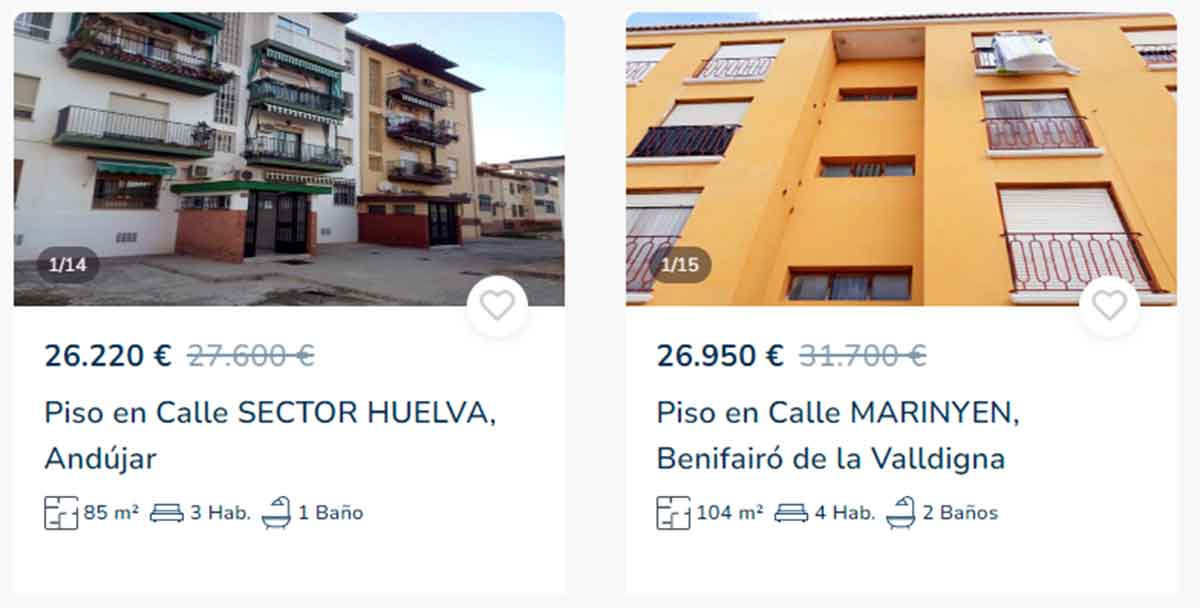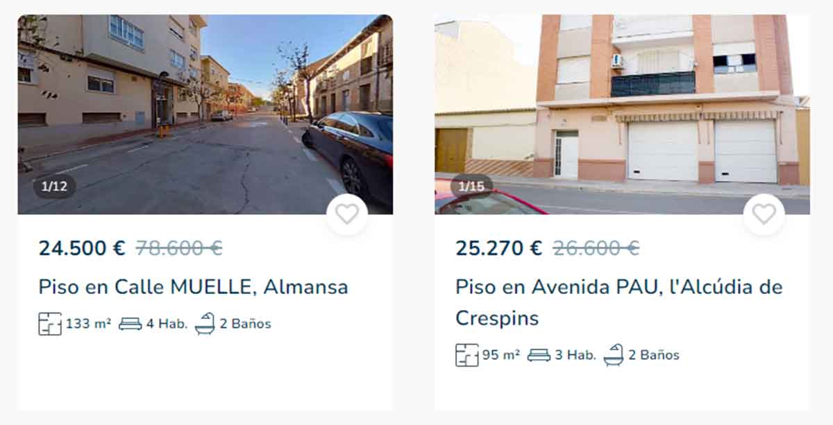 - Piso en L’Alcúdia de Crespins, Valencia, a la venta por 25.270 euros. Es una vivienda de 95 metros cuadrados con tres habitaciones y dos baños.