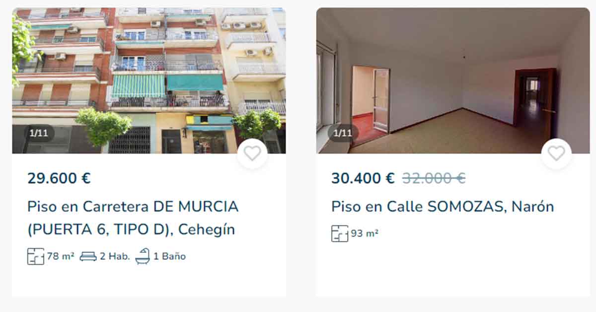- Piso en Cehegín, Murcia, por 29.600 euros. Tiene 78 metros cuadrados, dos habitaciones y un baño.