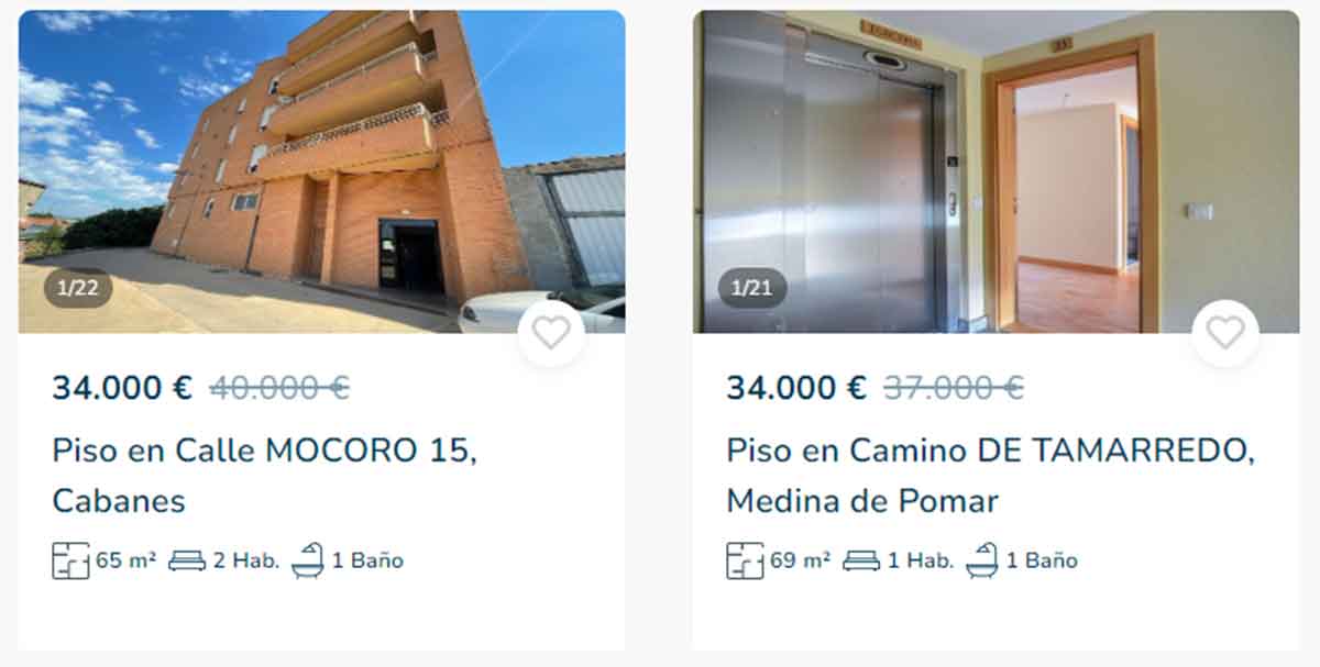 - Piso en venta por 32.000 euros en Castañares de Rioja. Es una vivienda con terraza de 109 metros cuadrados de superficie, dos habitaciones y dos baños.