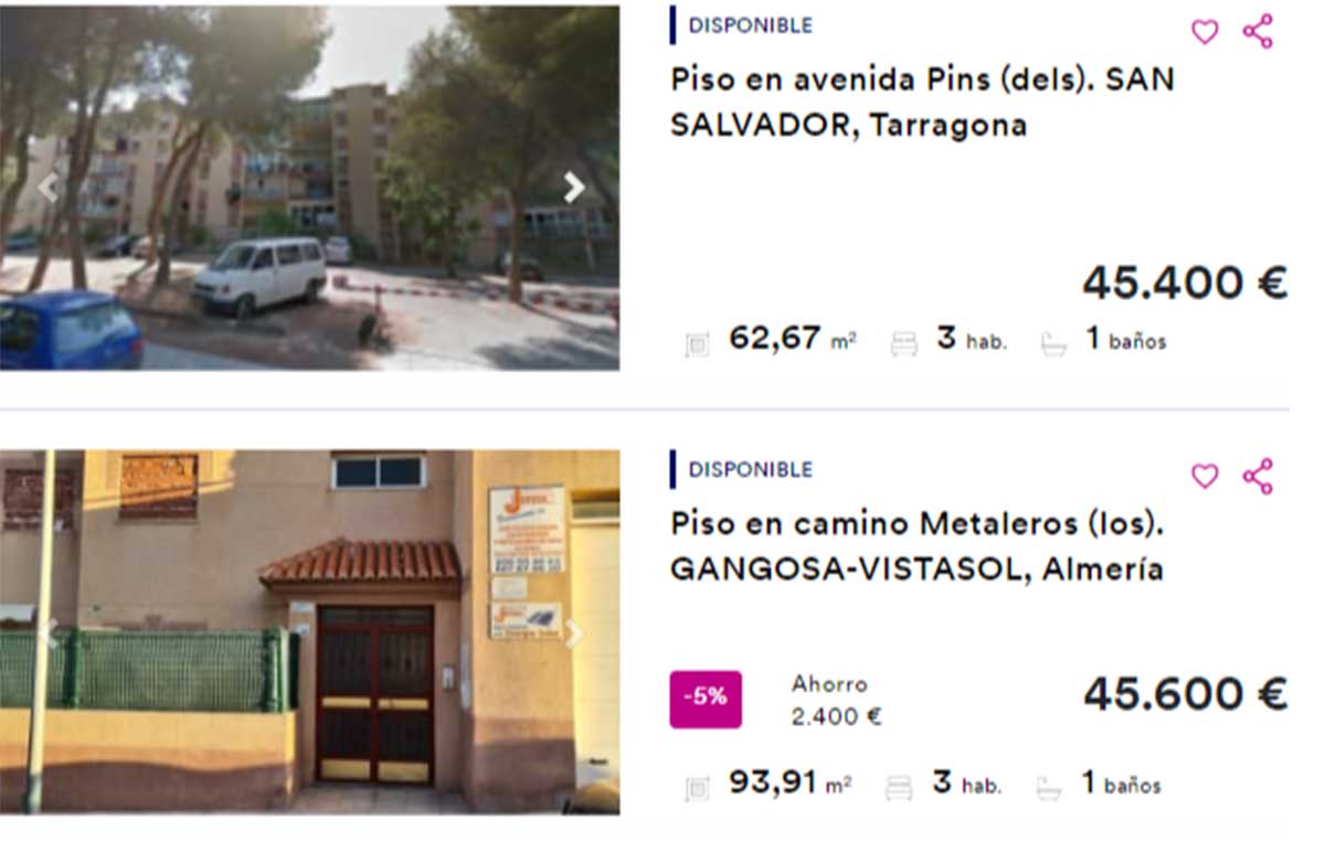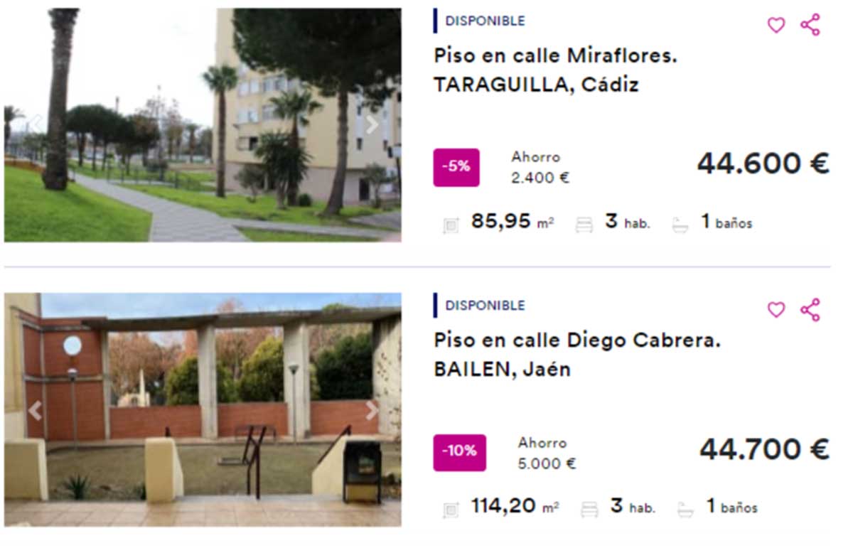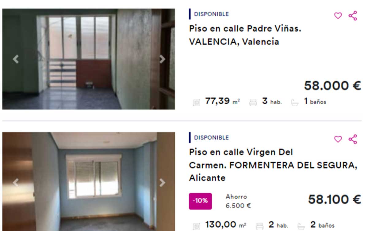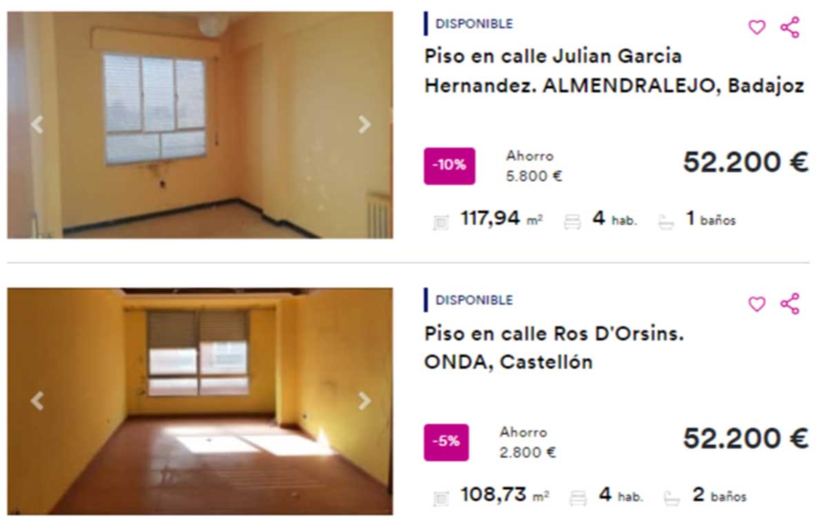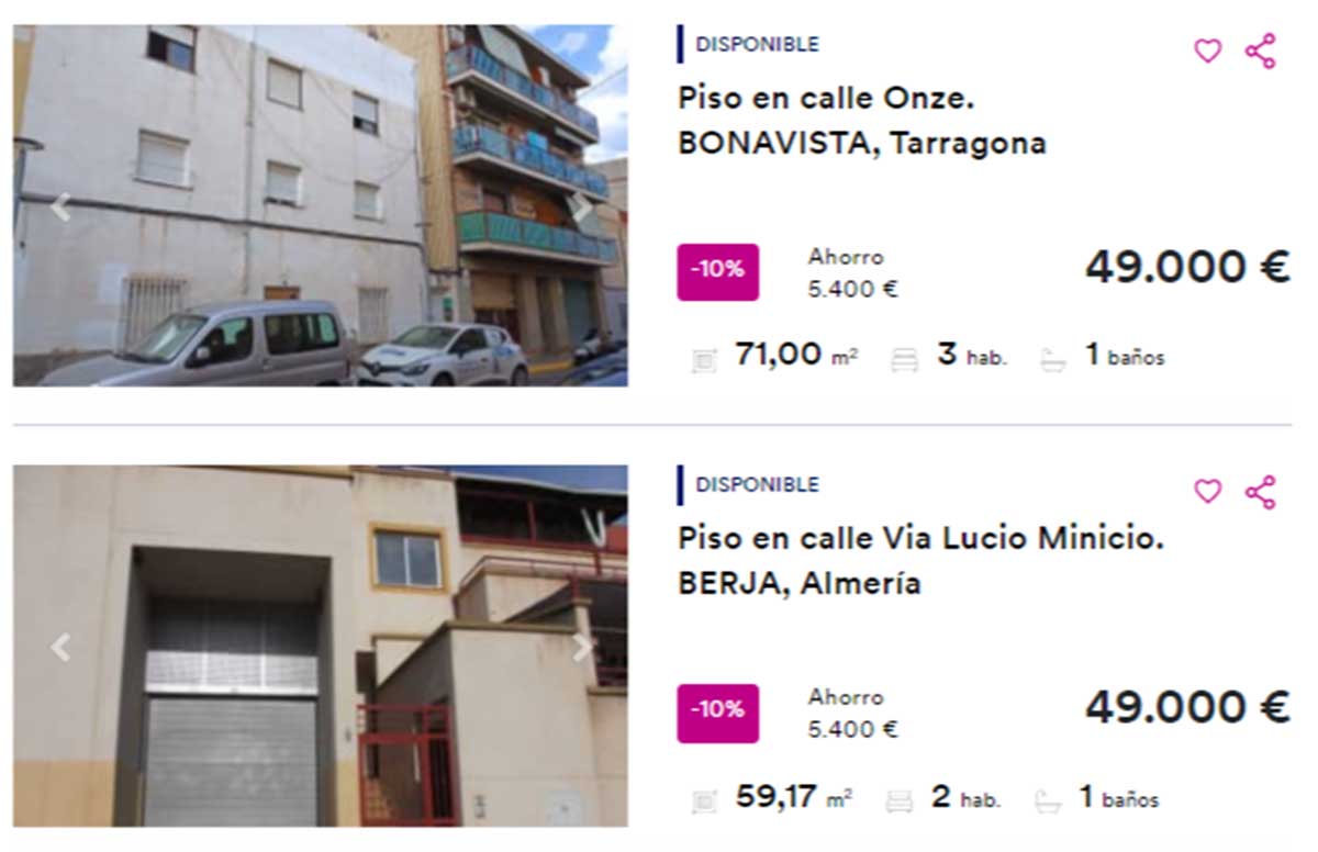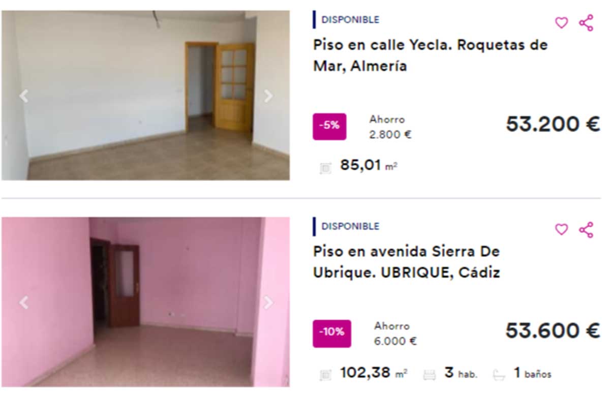 En una franja de precio algo superior, entre 50.000 y 60.000 euros, destacan las siguientes ofertas pisos del banco BBVA: