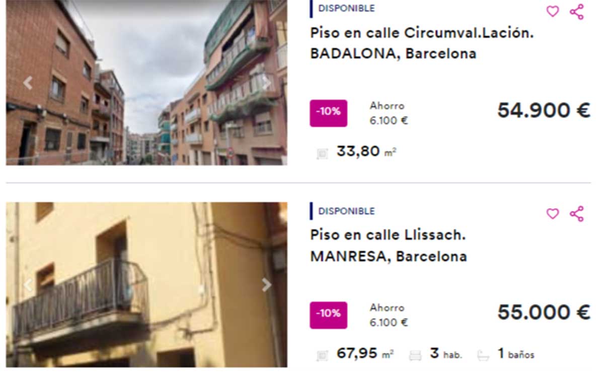 - Piso en venta por 55.000 euros en la localidad catalana de Manresa. Tiene 67 metros cuadrados distribuidos en tres habitaciones y un baño.