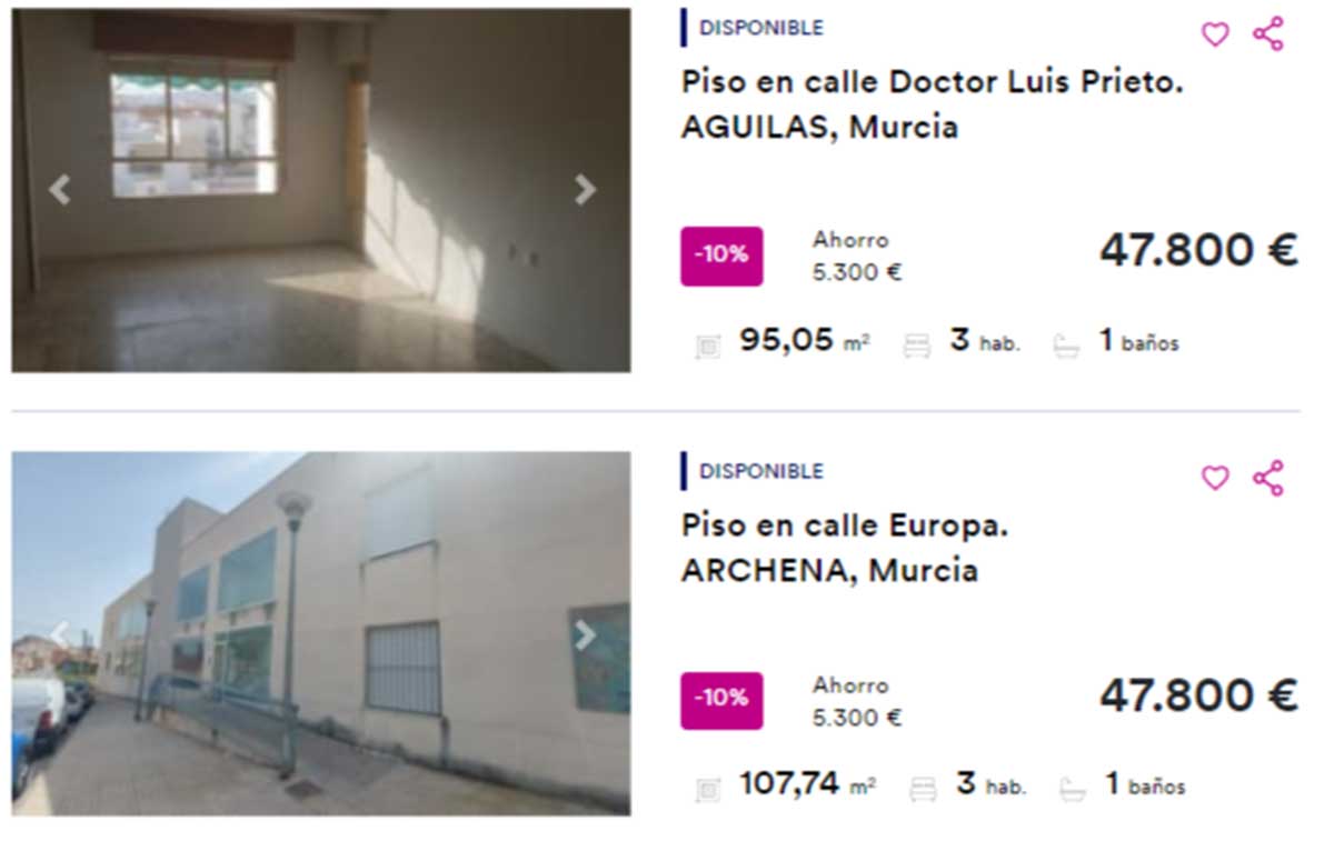 - Vivienda en venta en Las Águilas, Murcia, por 47.800 euros. Es un piso de 95 metros cuadrados distribuidos en tres habitaciones y un baño.