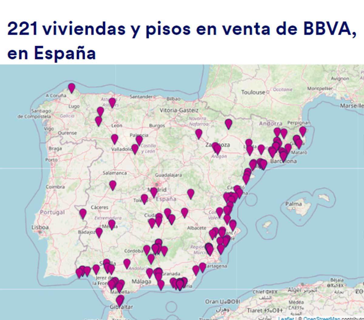 Más de 200 pisos de banco a la venta de BBVA por menos de 60.000 euros. Este es el catálogo de viviendas disponibles de la entidad a través del portal Haya Inmobiliaria.