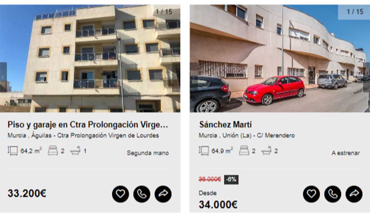 - Vivienda en venta en La Unión, Murcia, con garaje incluido por 34.000 euros. Es un piso de 64 metros cuadrados con dos habitaciones y dos baños.