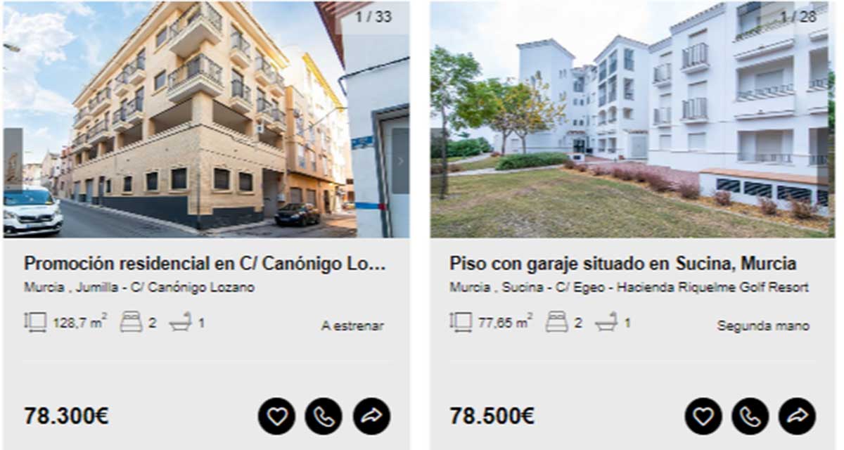 - Vivienda en venta con garaje en Sucina, Murcia, por 78.500 euros. Es un piso de 77 metros cuadrados con dos habitaciones y un baño.