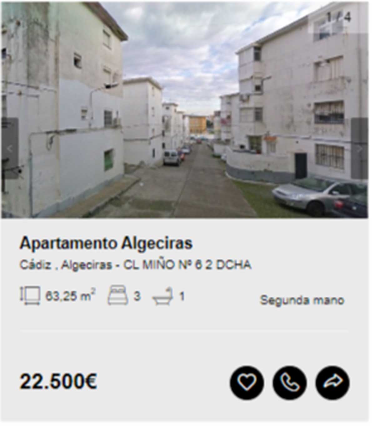 - Apartamento en venta en la localidad de Algeciras, Cádiz, por 22.500 euros. Es una vivienda de 63 metros cuadrados distribuidos en tres habitaciones y un baño.