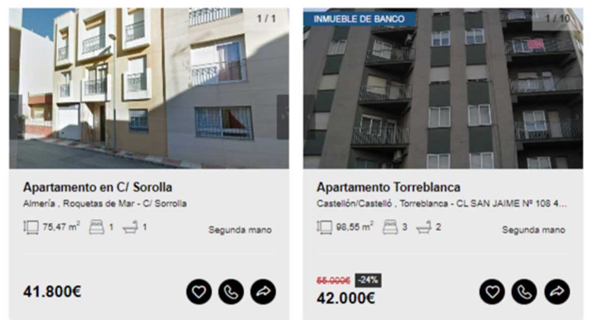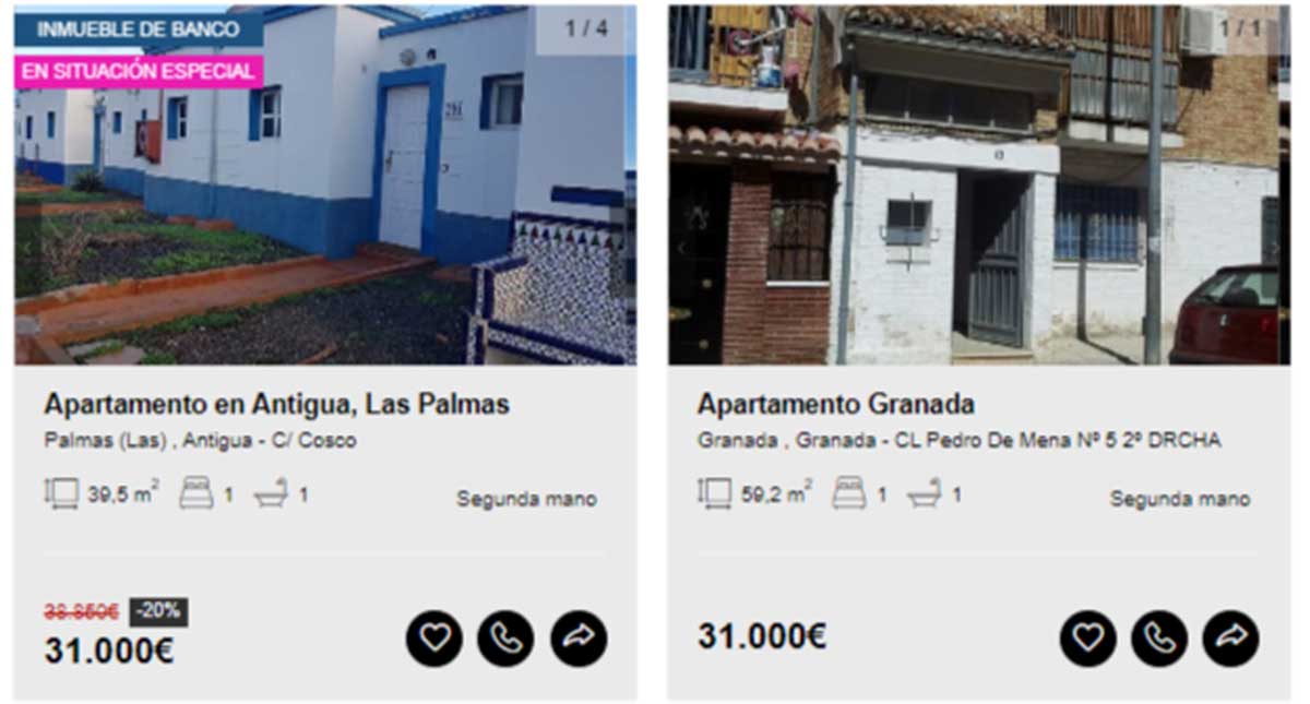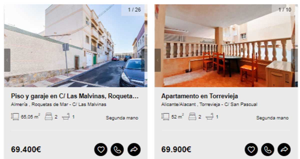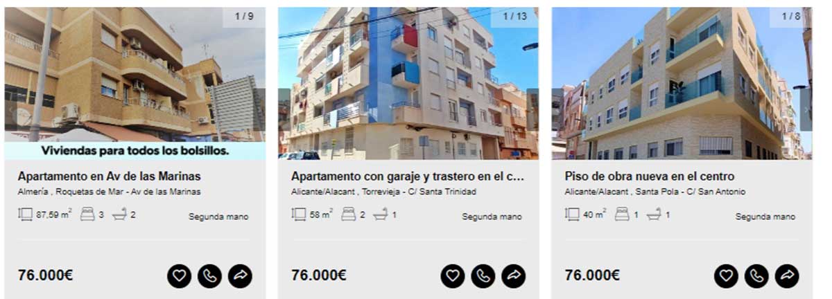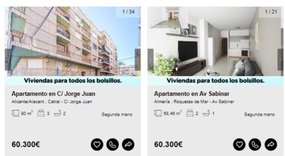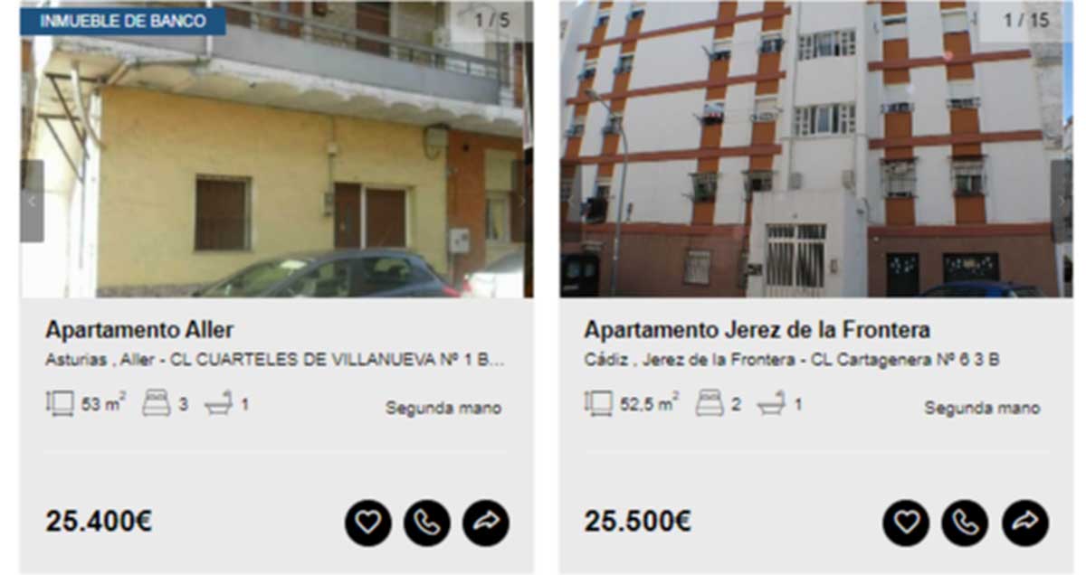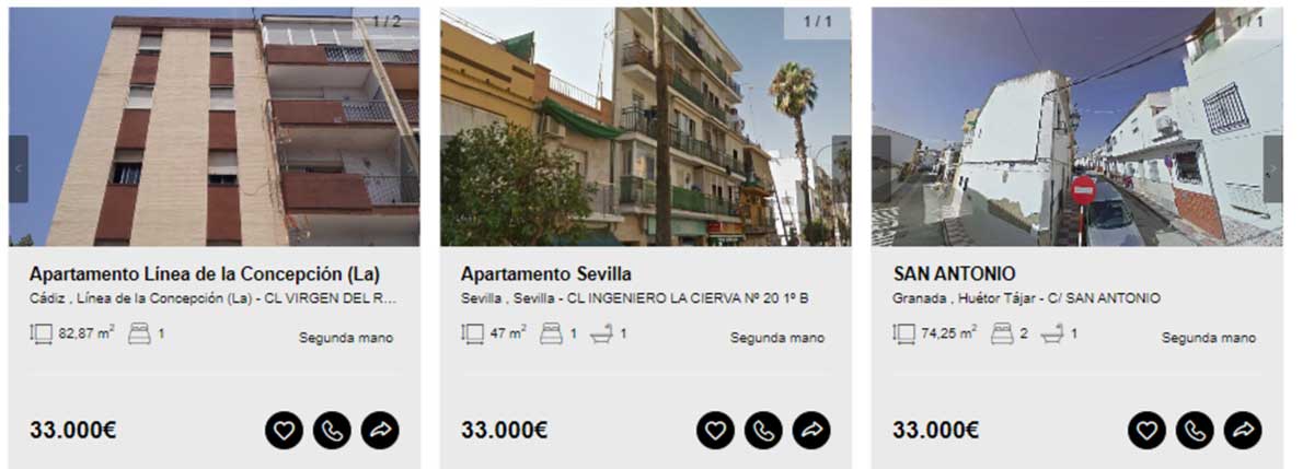 Aunque en el portal de Solvia hay viviendas disponibles desde los 2.000 euros, en esta guía solamente se incluyen aquellas que pueden comprarse libre de cargas y sin que tenga asociados varios propietarios en proindiviso o se encuentren en estado declarado de ruina. Motivo por el que los ejemplos comienzan desde los 20.000 euros.