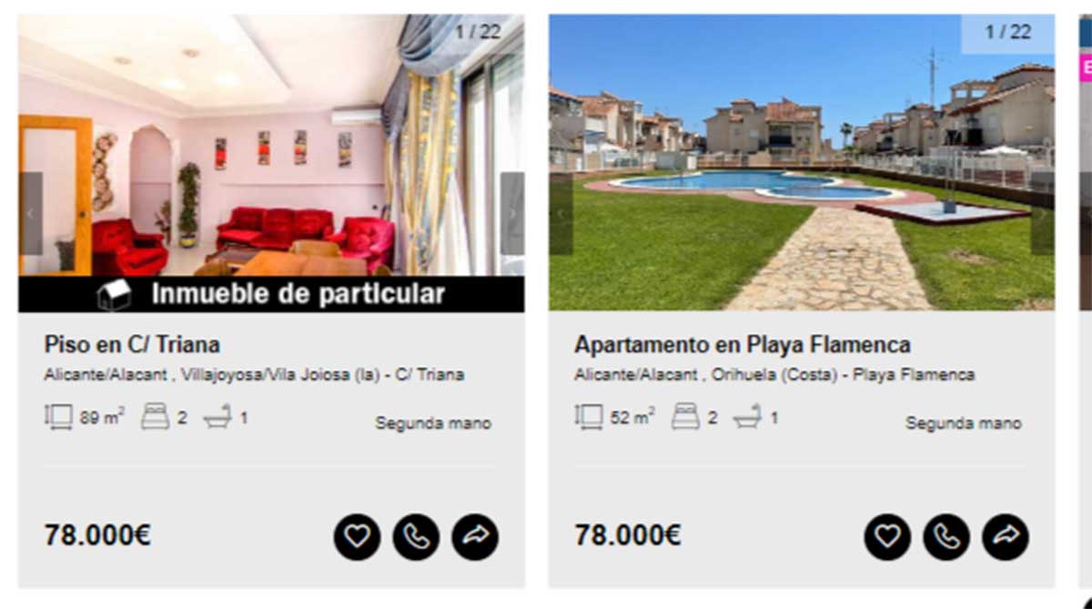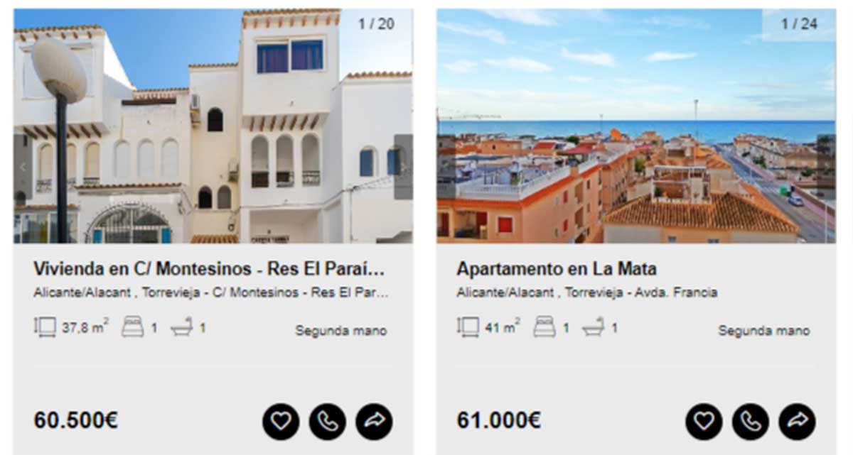 - Vivienda en venta por 78.000 euros en la localidad de Orihuela, Alicante. Tiene 52 metros cuadrados distribuidos en dos habitaciones y un baño.