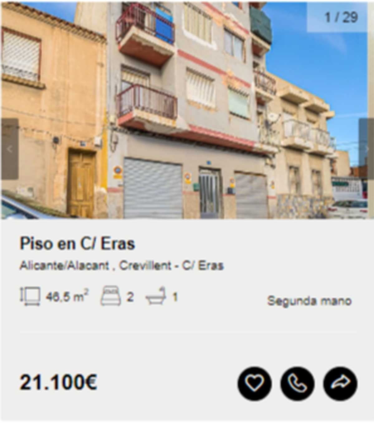 - Piso en venta en Crevillent, Alicante, por 21.100 euros. Se trata de un apartamento de 46 metros cuadrados distribuidos en dos habitaciones y dos baños.