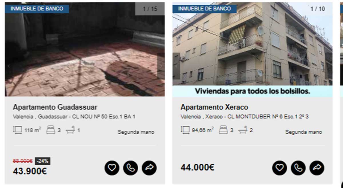 - Apartamento en venta en la localidad de Guadassuar, Valencia, por 43.900 euros. Es una vivienda de 118 metros cuadrados distribuidos en tres habitaciones y un baño.