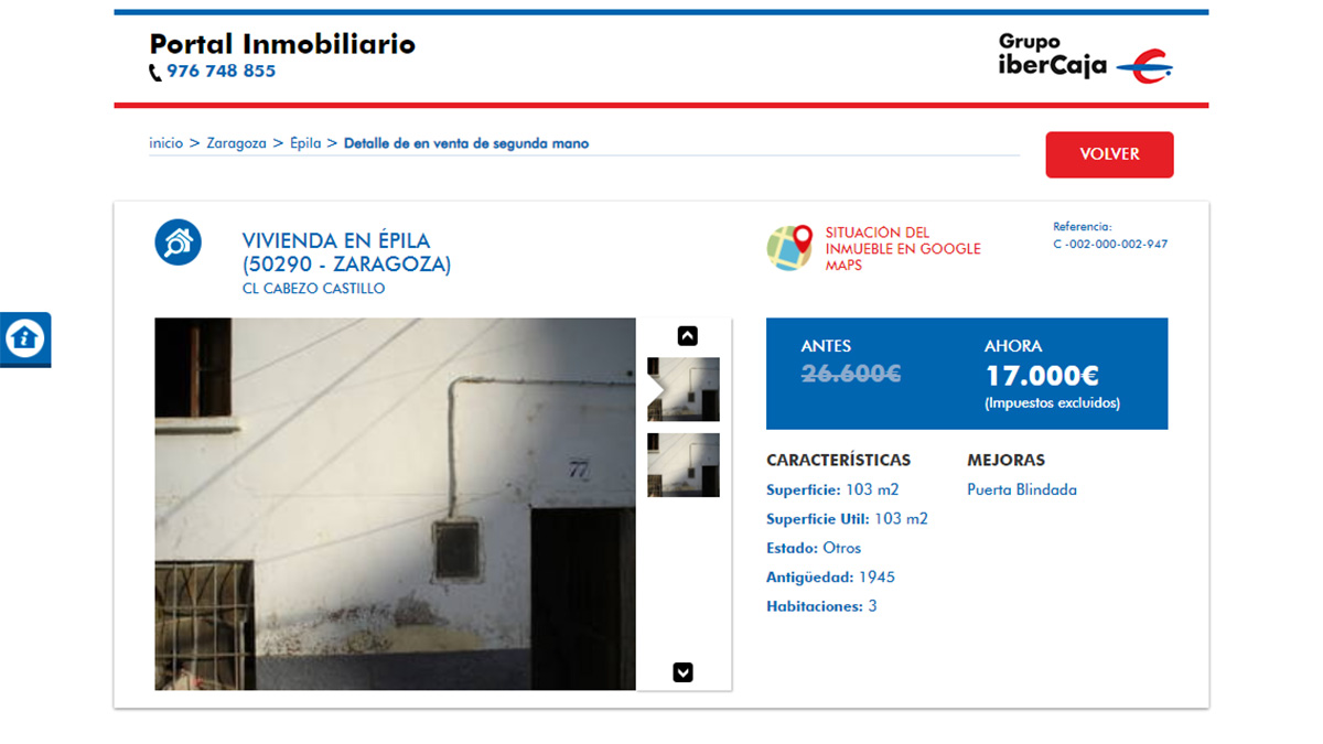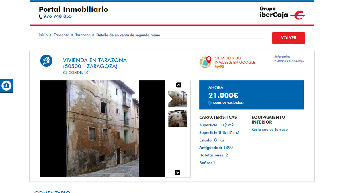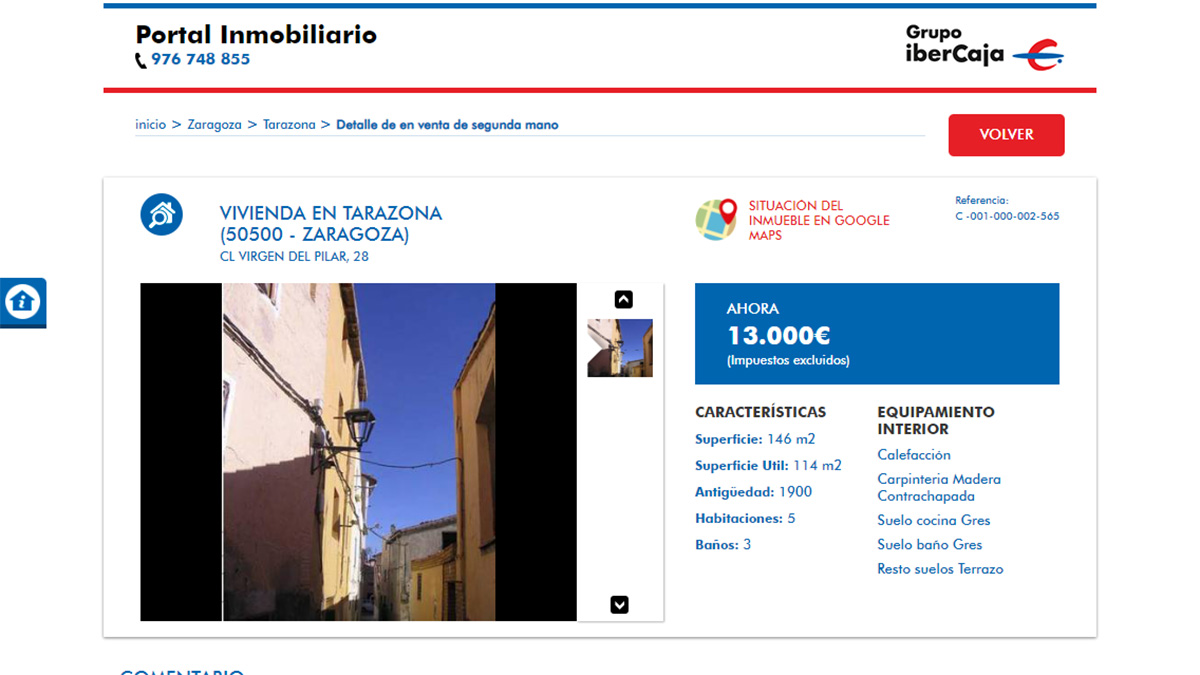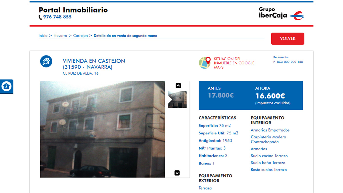 El piso en venta más barato del portal inmobiliario de Ibercaja está a la venta por 8.200 euros. Se trata de una vivienda de 3 dormitorios y 78 metros cuadrados ubicada en La Rioja. Aunque la oferta no tiene fotografías de las estancias de la vivienda para que los usuarios puedan verla.