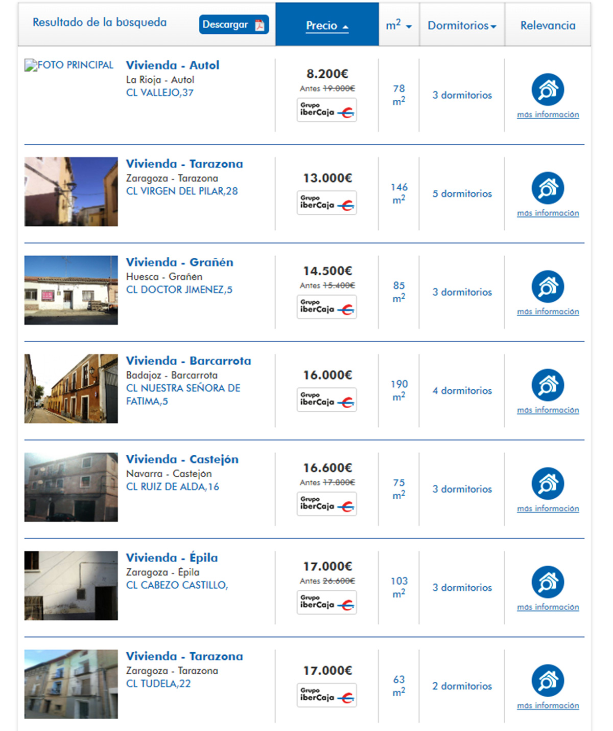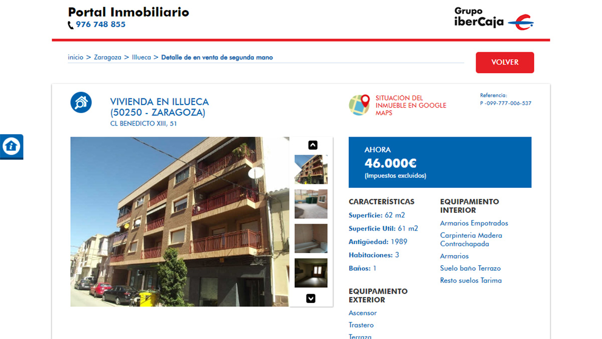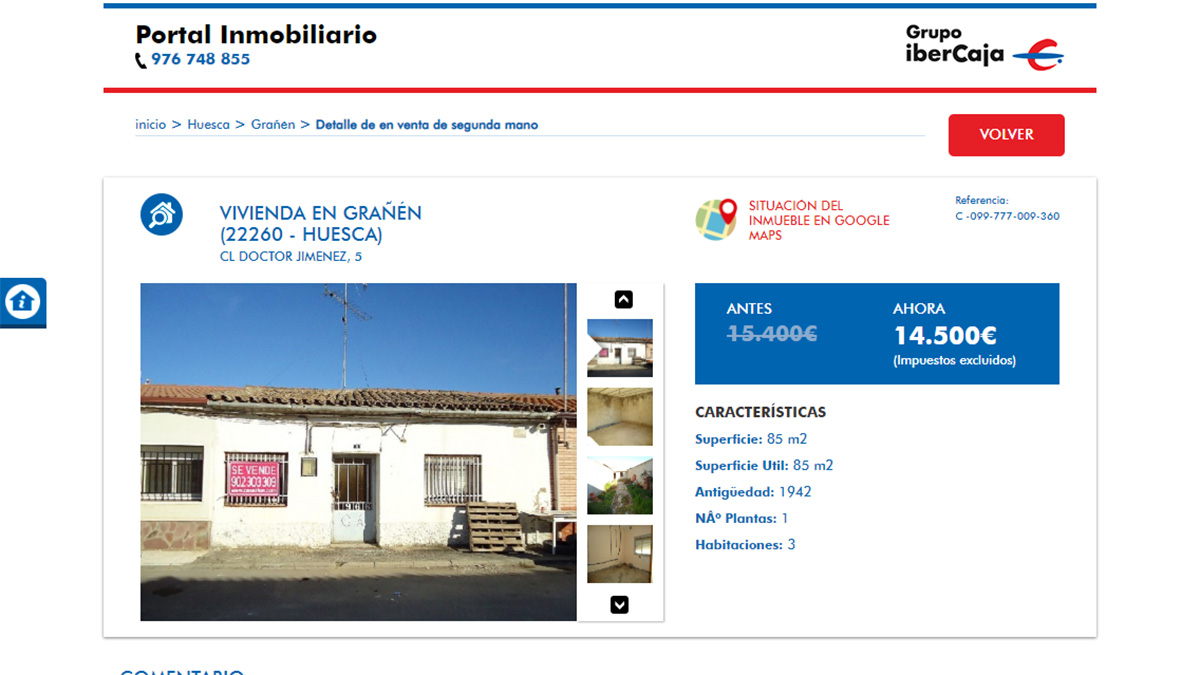 El portal inmobiliario de Ibercaja tiene un catálogo de 32 pisos procedentes de bancos en venta por menos de 60.000 euros. Los inmuebles se encuentran distribuidos principalmente por la comunidad autónoma de Aragón, aunque también hay ofertas en otras autonomías cercanas, como Navarra, Cataluña, La Rioja y Asturias.