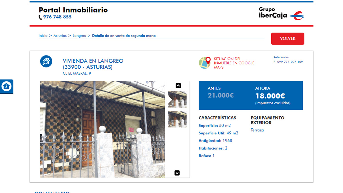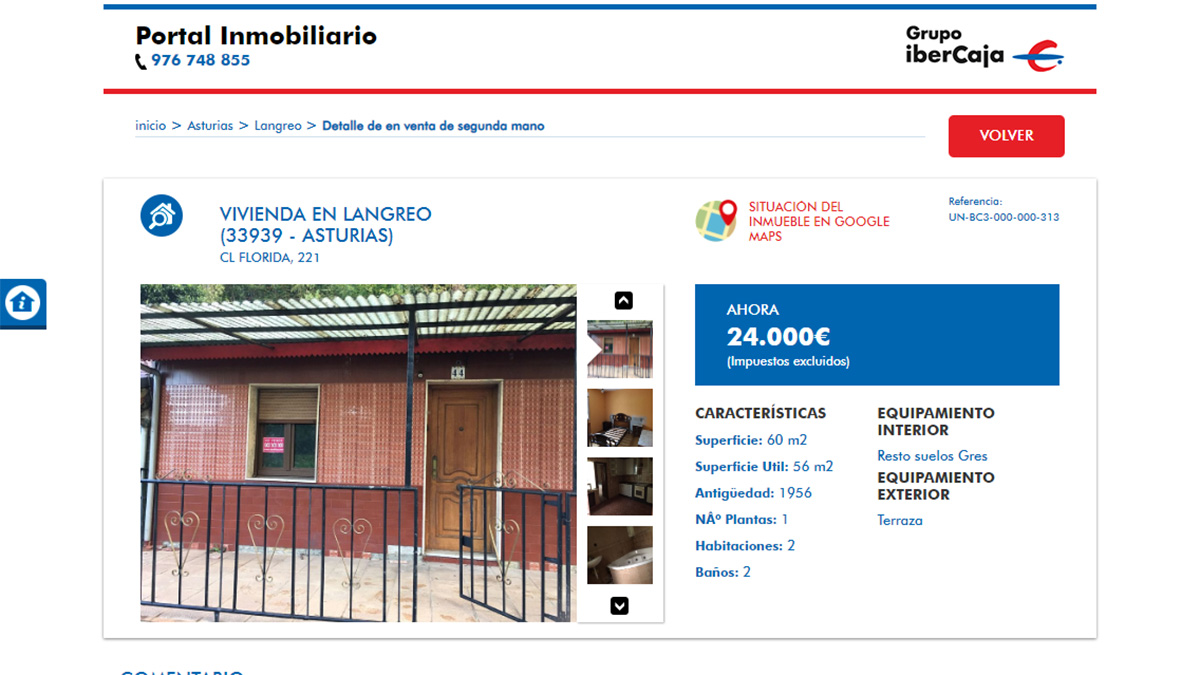 Un último ejemplo. Por 18.000 euros destaca una vivienda en la localidad de Langreo, Asturias. Se trata de una casa de 50 metros cuadrados de dos habitaciones y un baño que necesita reforma.