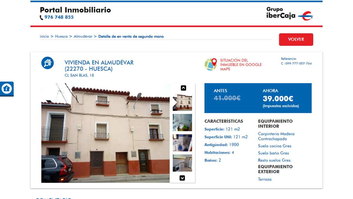 Otro ejemplo. Vivienda por 39.000 euros en venta en la localidad de Almudévar, Huesca. Tiene un total de 121 metros cuadrados distribuidos en 4 dormitorios y dos baños.