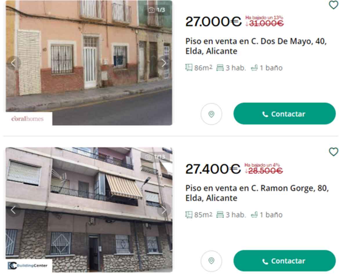 - Por 27.000 euros se vende un piso en Elda, Alicante. Tiene 86 metros cuadrados que se distribuyen entres habitaciones y un baño.