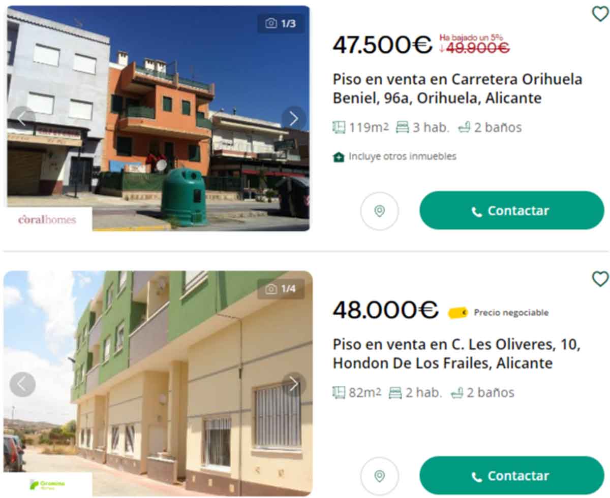 - Piso en venta por 48.000 euros en la localidad de Hondón de los Frailes, Alicante. Tiene 82 metros cuadrados, dos habitaciones y dos baños.