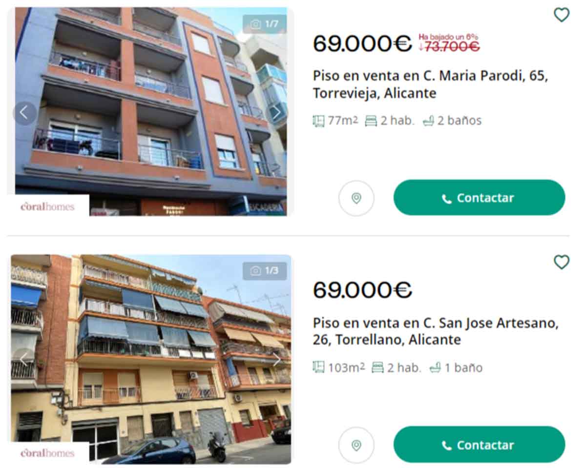 - Por 69.000 euros se vende un piso en Torrevieja, Alicante. Es una vivienda de 77 metros cuadrados con dos habitaciones y dos baños.