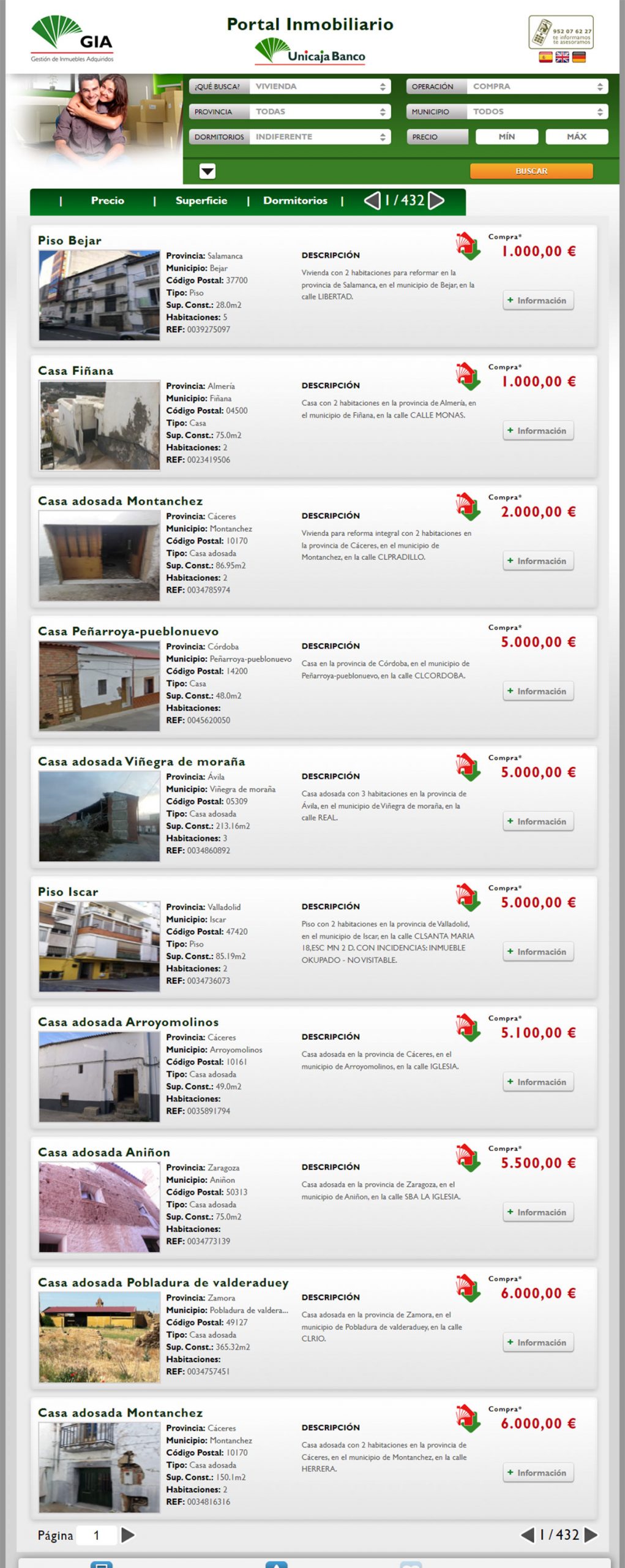 Al hacerlo, aparece en pantalla el listado completo de viviendas disponibles para comprar de Unicaja Banco, tal y como aparece en la siguiente imagen.