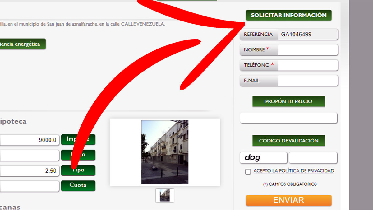 En la parte derecha de la pantalla hay un formulario que dice ‘Solicitar información‘. Para contactar con la entidad y pedir información sobre un inmueble o solicitar una visita hay que completar este formulario. Solamente hay que indicar el nombre, un número de teléfono y un correo electrónico.