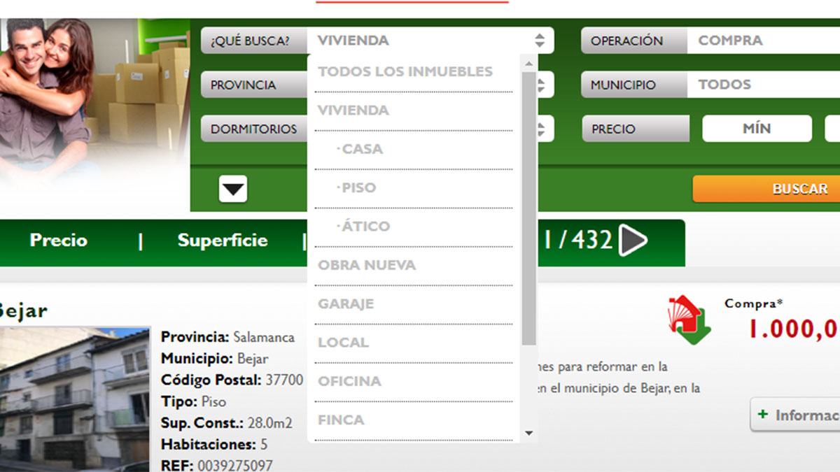 - Tipo de inmueble. Entre las principales opciones, es posible filtrar la búsqueda por vivienda, categoría en la que se incluyen casas, pisos y áticos, o hacer búsquedas de garajes, locales, oficinas y fincas, entre otros.