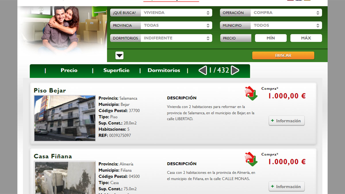 Al aplicar los filtros anteriores, en la pantalla aparece un listado de viviendas de diferentes tipos, precios y ubicaciones. Para centrar la búsqueda y ver solamente aquellas viviendas que puedan interesarte, hay que volver al buscador principal para establecer las preferencias de búsqueda. En concreto, en este portal es posible indicar los siguientes criterios: