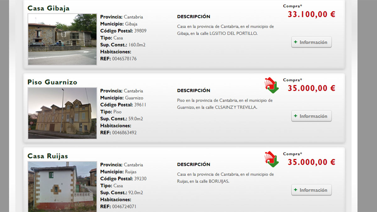 Un último ejemplo. En la localidad de Cantabria hay un total de 214 pisos de Unicaja banco disponibles a la venta. Las viviendas más baratas se encuentran por 33.100 euros y las más caras superan los 300.000 euros.