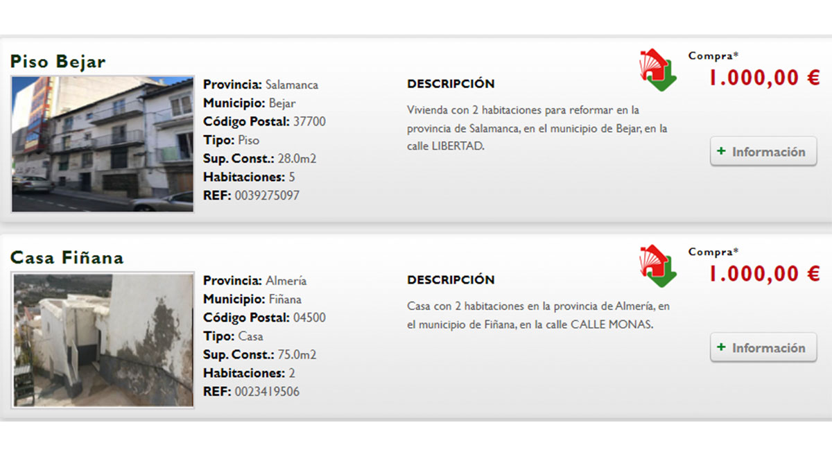 Como puedes ver en la imagen, hay dos viviendas a la venta por 8.000 euros. Pero tal y como aparece detallado en la descripción, no son viviendas que puedan visitarse porque están ocupadas.