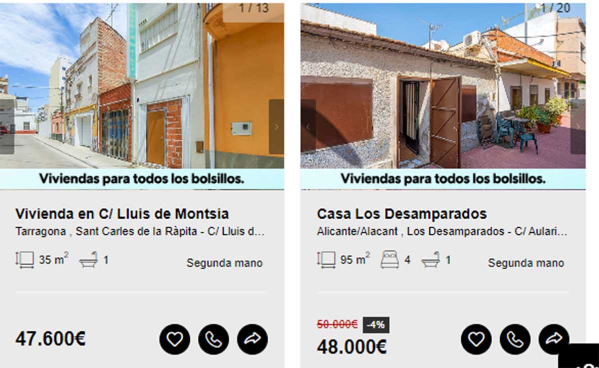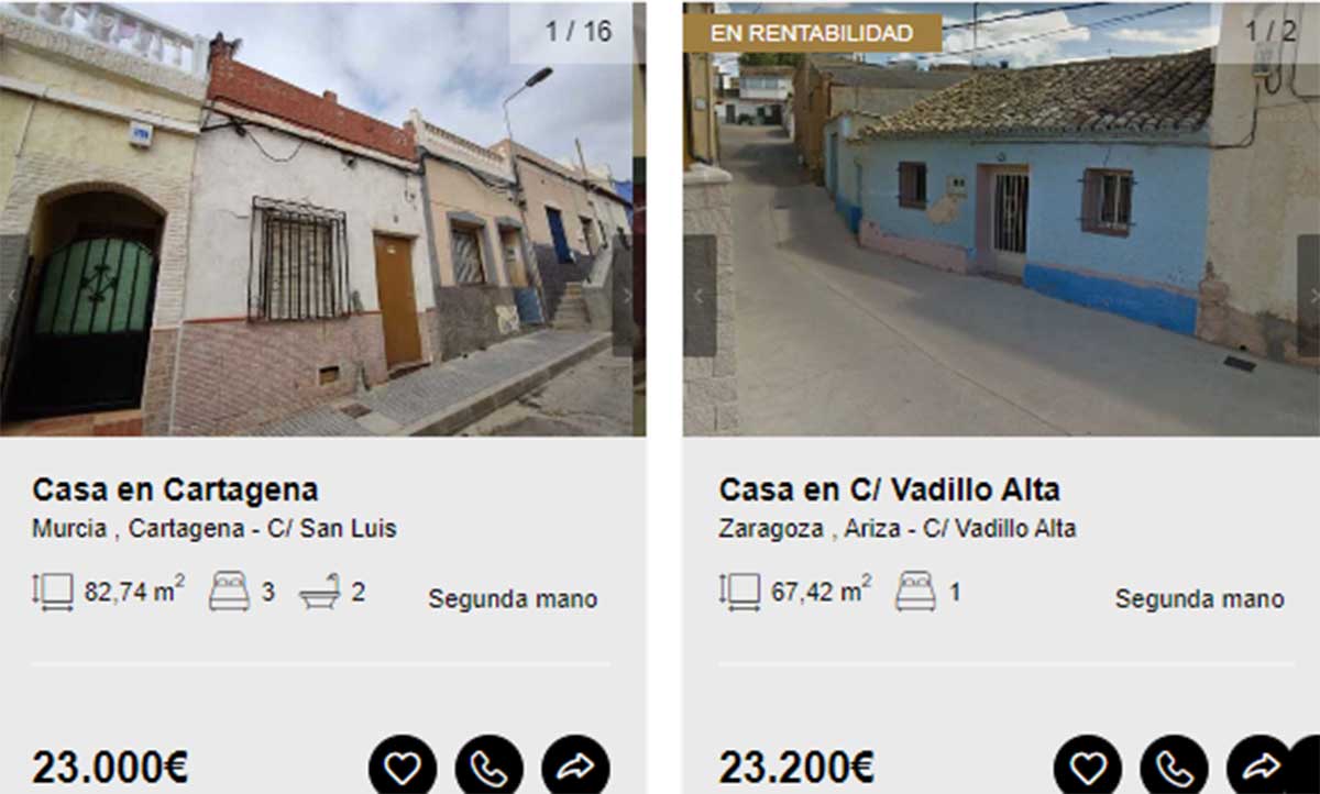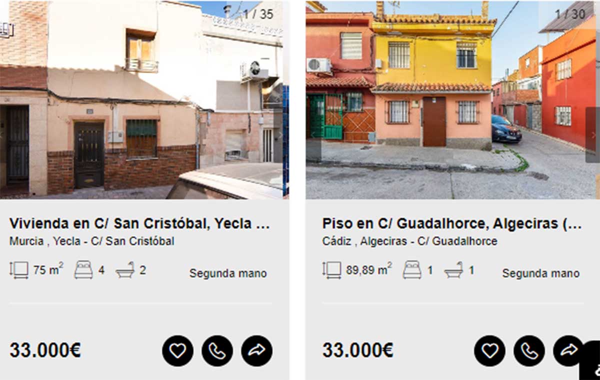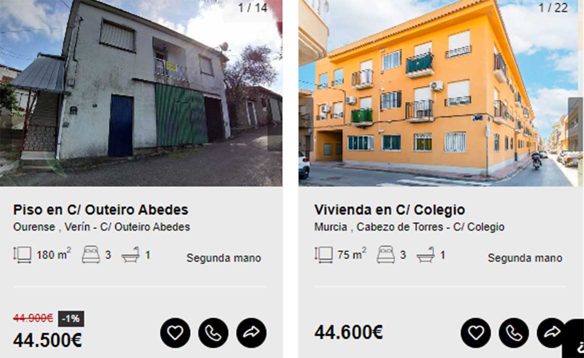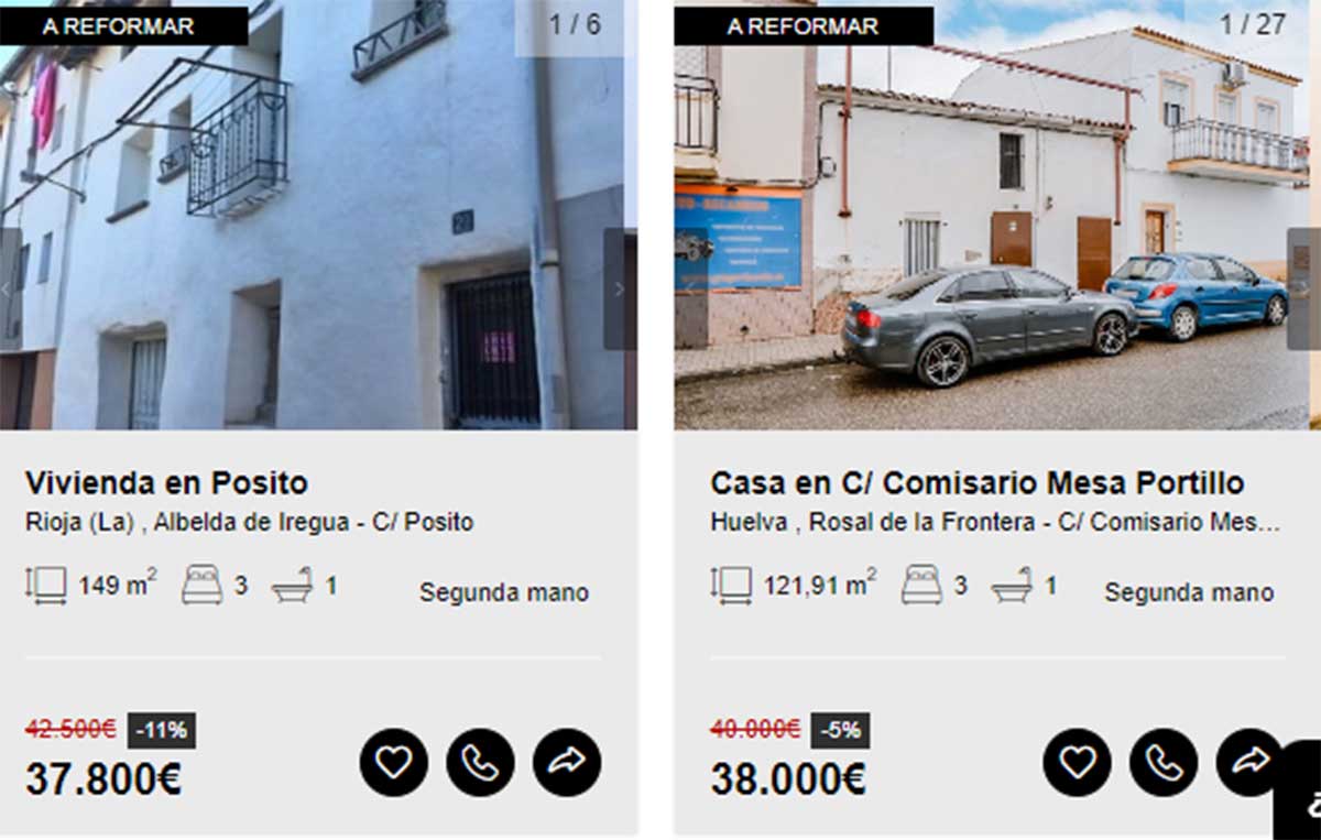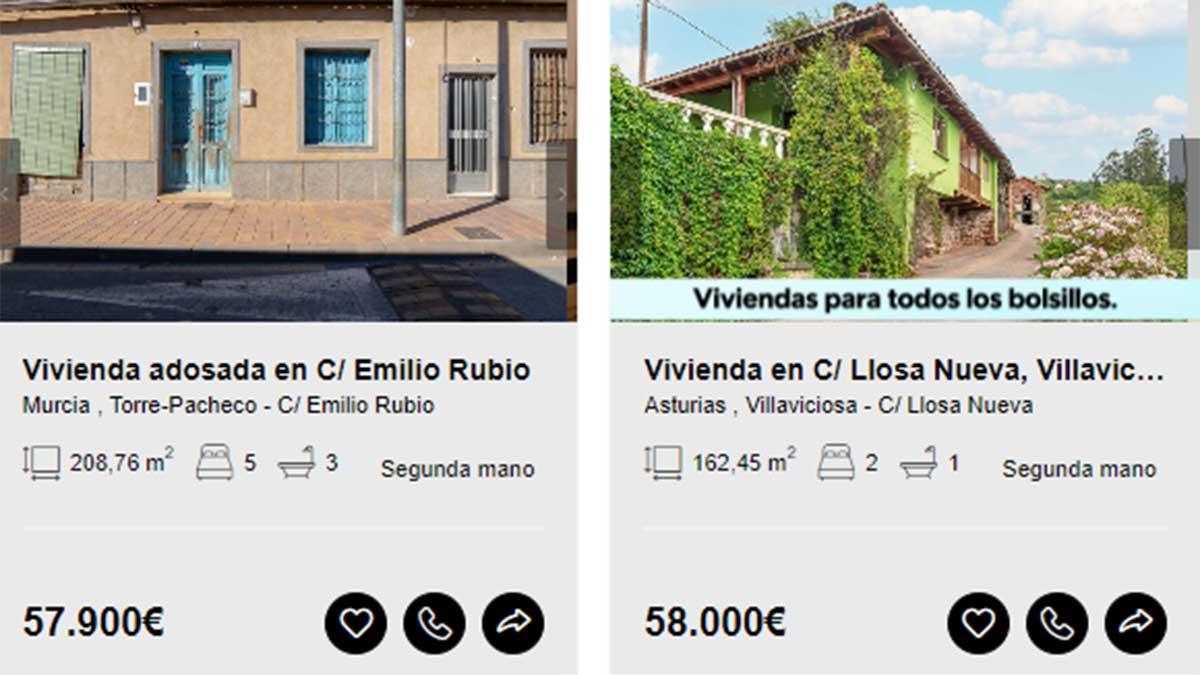 Por último, en una horquilla de precio superior, destacan las viviendas del catálogo de Solvia que se venden entre 30.000 y 60.000 euros. A continuación puedes consultar algunos ejemplos de estas ofertas disponibles: