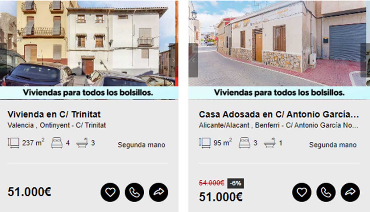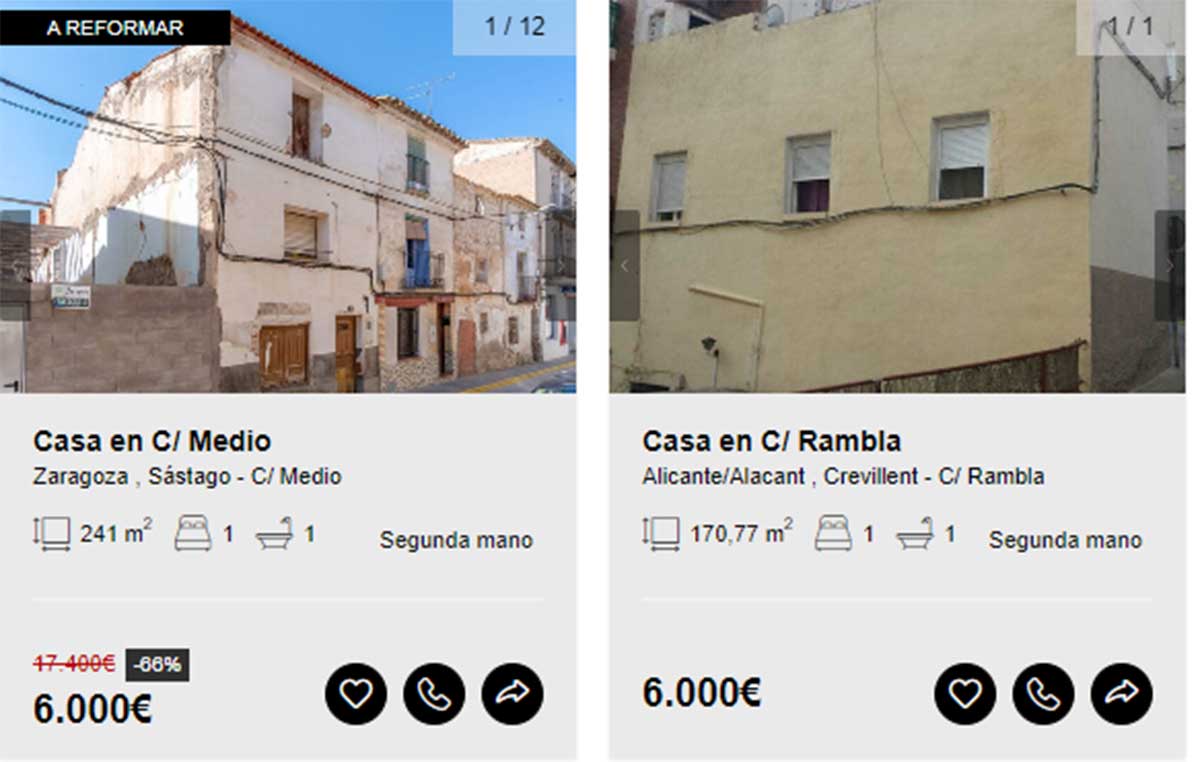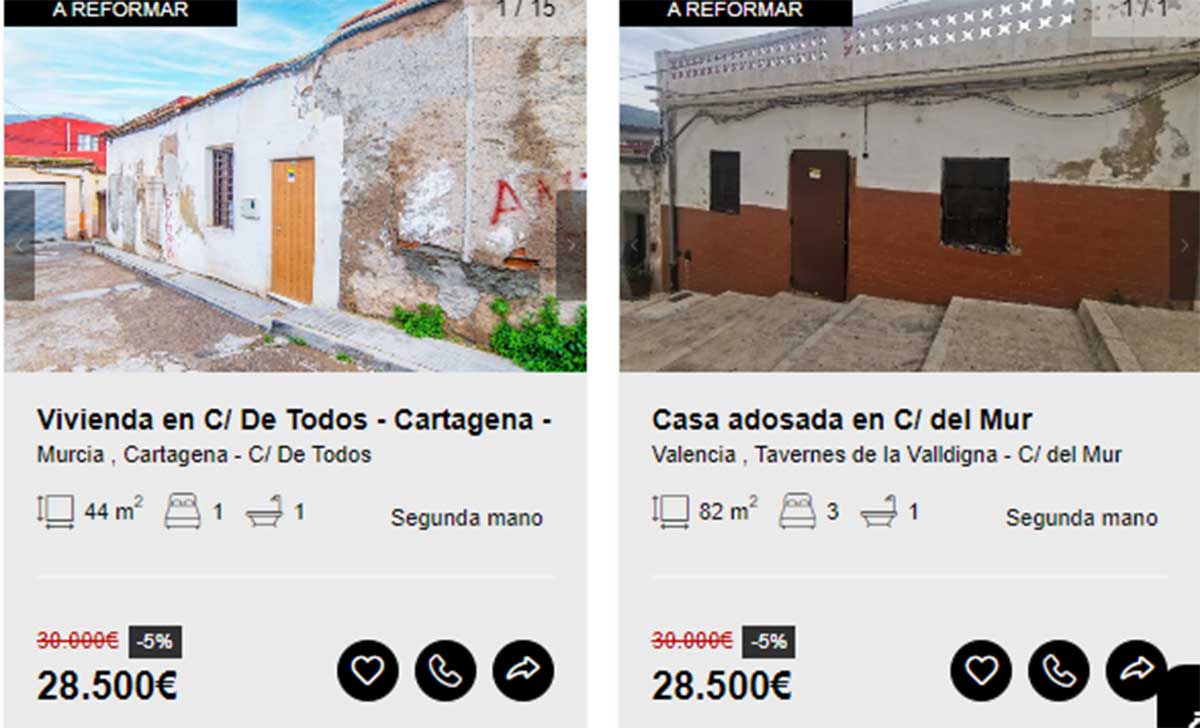 - Otra oferta similar se encuentra en Crevillent, Alicante. Es una vivienda de 170 metros cuadrados de una habitación y un baño para reformar que se vende por 6.000 euros.