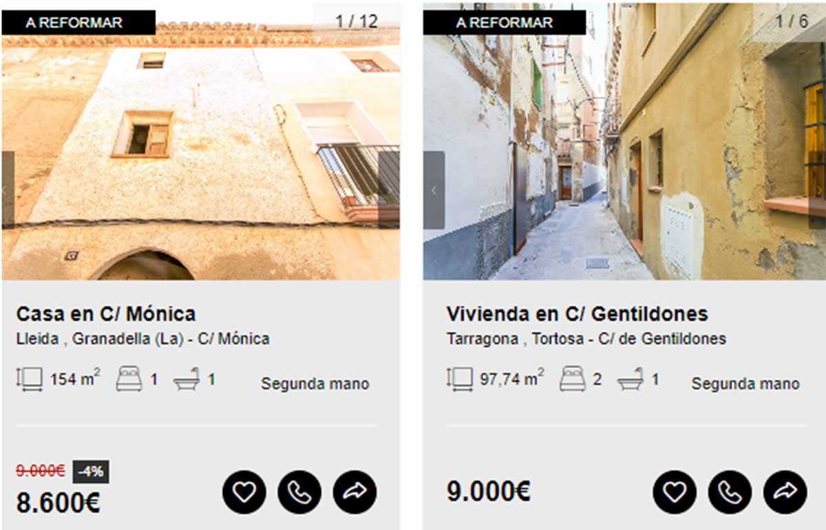 - Casa en venta en La Granadella, Lleida, por 8.600 euros. Es una vivienda de 154 metros cuadrados que necesita una reforma con una habitación y un baño.