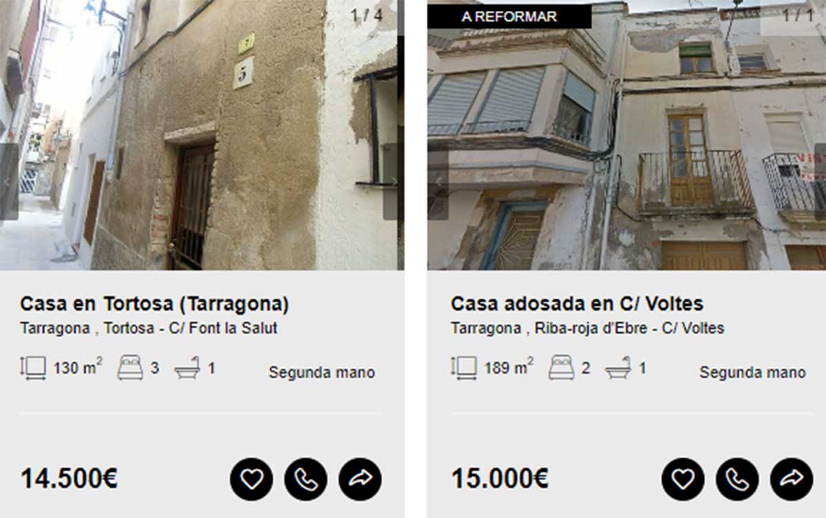- Vivienda adosada en venta en Tarragona por 15.000 euros. Es una vivienda de dos habitaciones y un baño distribuidos en 189 metros cuadrados que necesita una reforma.