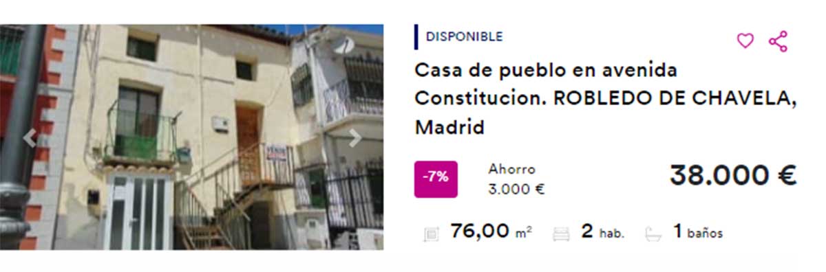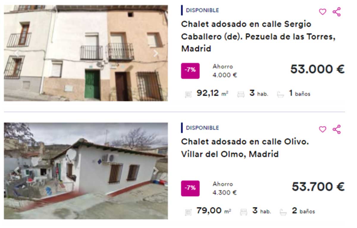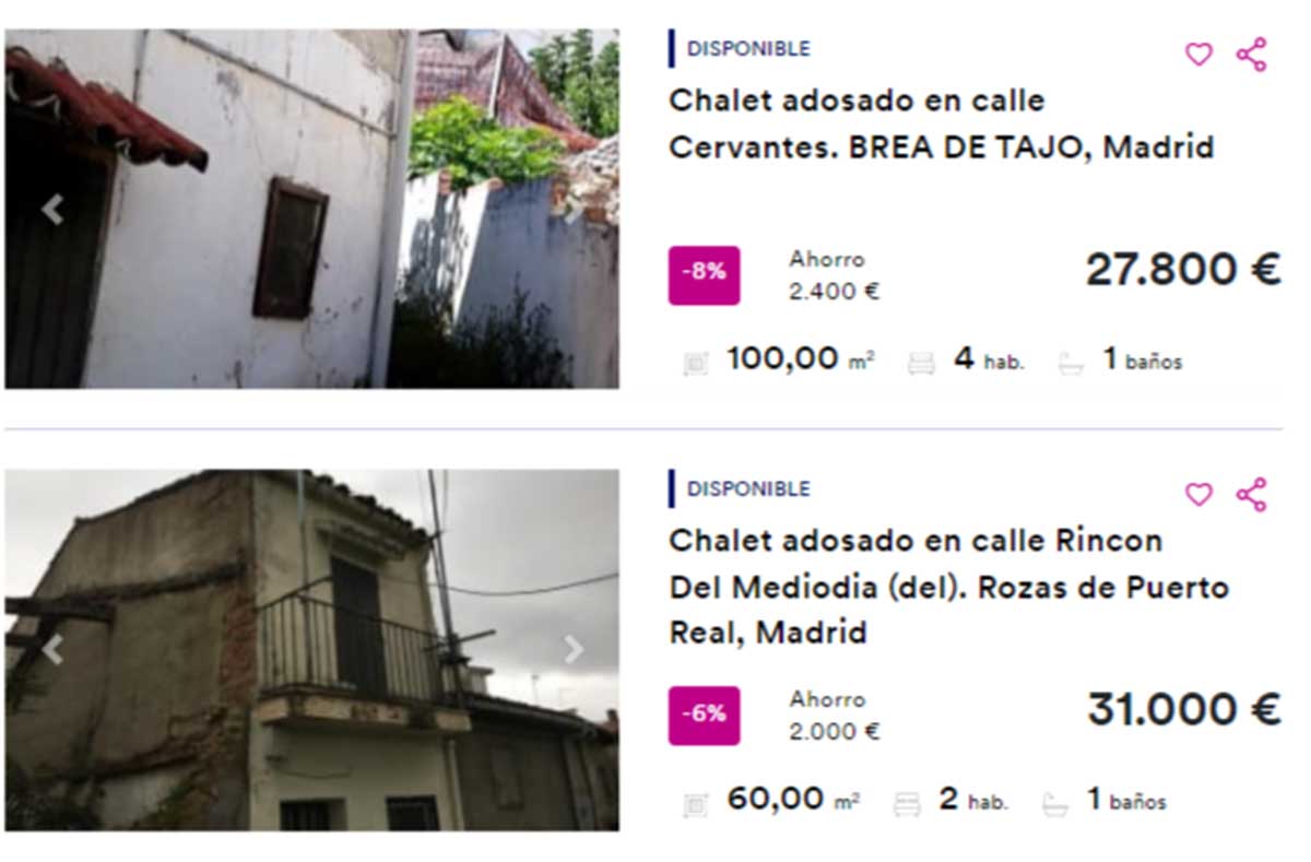 - Chalet adosado en Rozas de Puerto Real, Madrid, a la venta por 31.000 euros. La vivienda tiene 60 metros cuadrados distribuidos en dos habitaciones y un baño.