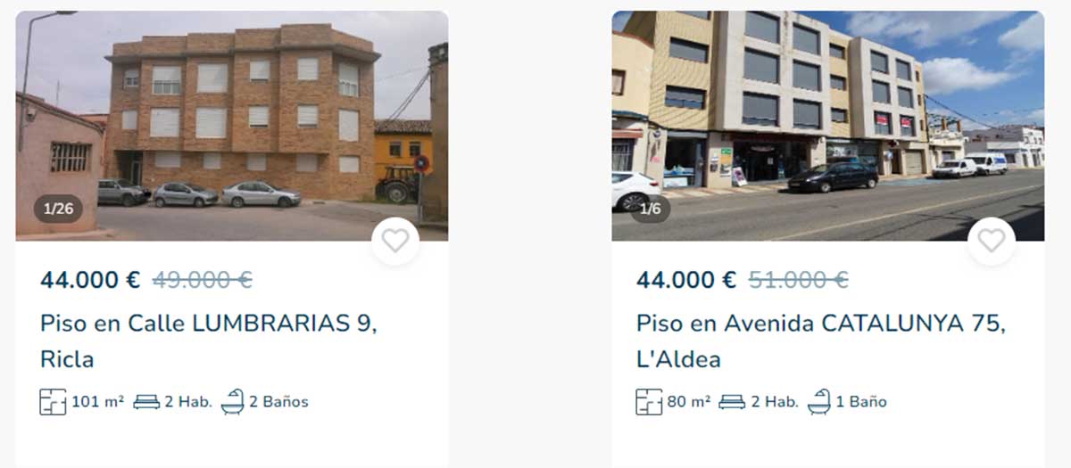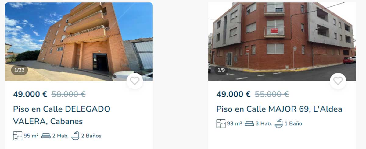 - Vivienda en venta en L’Aldea por 44.000 euros. Es un piso de 80 metros cuadrados con dos habitaciones y un baño.