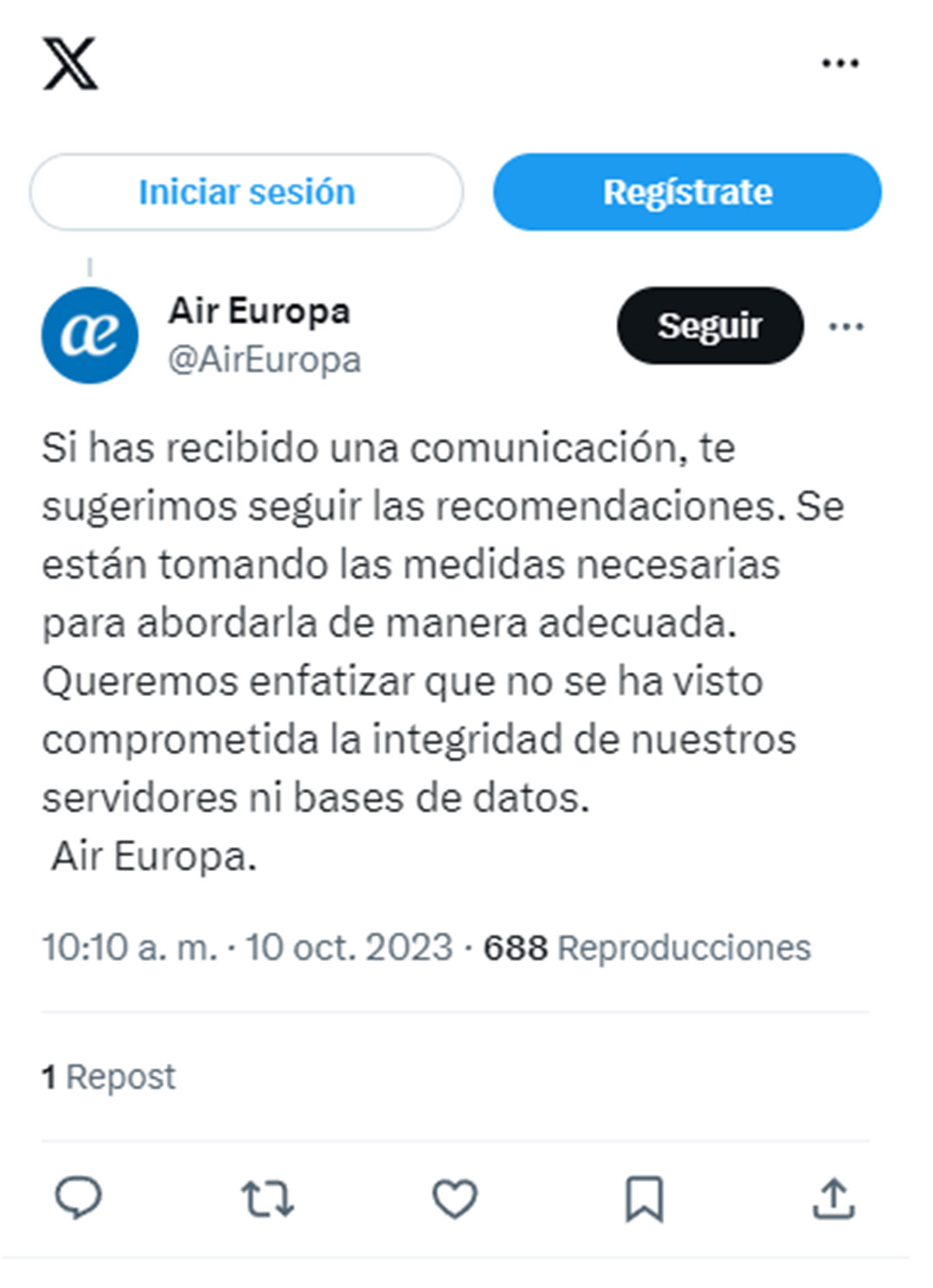 En concreto, la aerolínea ha avisado a los clientes afectados por este robo de datos a través de un correo electrónico, donde les ha pedido que se pongan en contacto con su banco para cancelar la tarjeta de crédito. El objetivo es evitar posibles estafas o robo de dinero de la tarjeta de crédito. En concreto, la propia compañía ha hecho un comunicado que ha compartido en la red social X en el que recomendaba los pasos a seguir por los usuarios afectados.