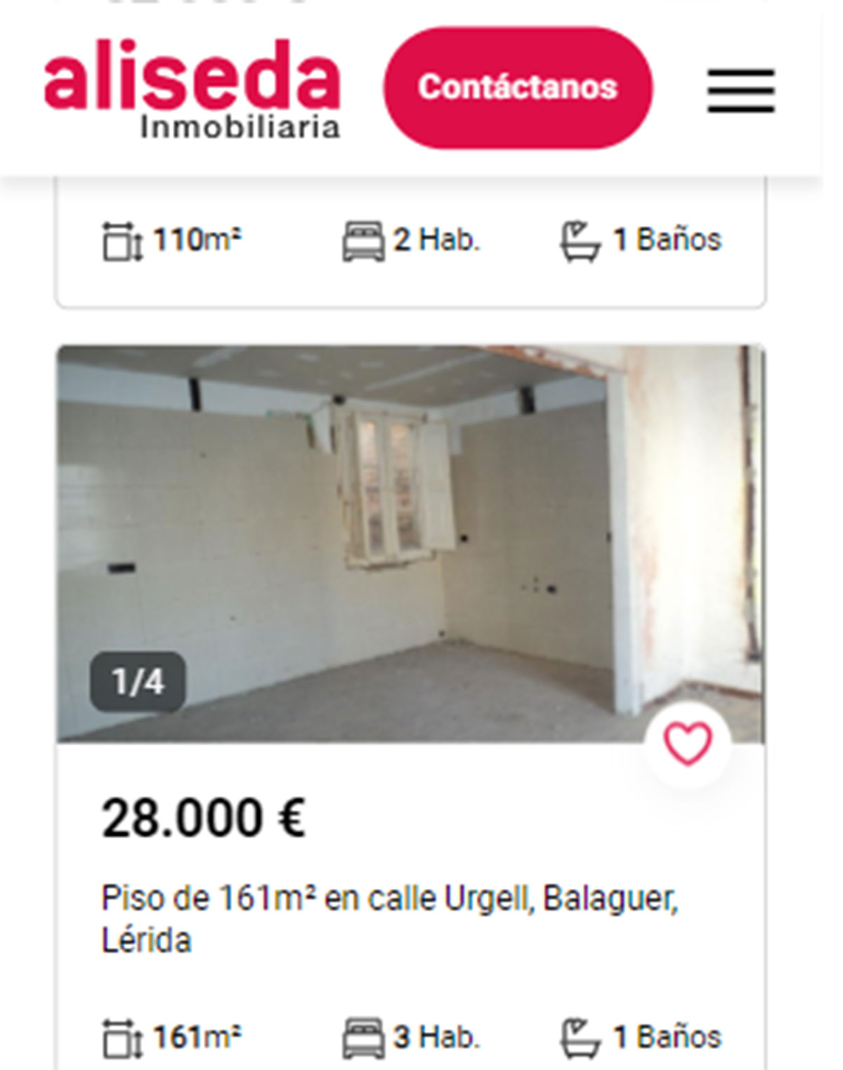 Por 28.000 euros destaca un piso en Balaguer, Lleida. Es una vivienda de tres habitaciones y un baño en 161 metros cuadrados.