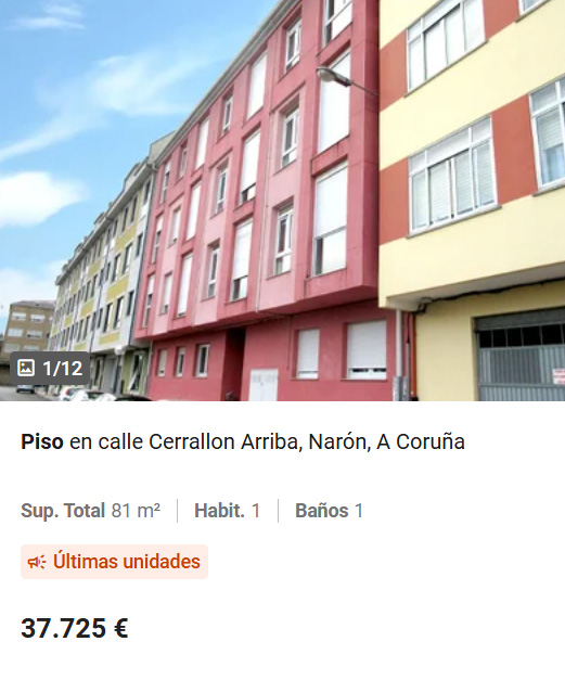 En Narón (A Coruña) está a la venta este piso desde 37.725 euros. El inmueble tiene 81 m² de superficie total construida y se distribuye en un dormitorio, un baño, salón-comedor y cocina.
