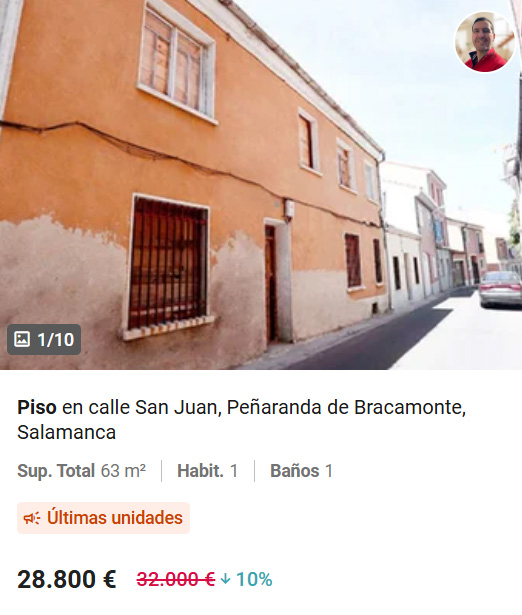 En Peñaranda de Bracamonte (Salamanca) se vende este piso por 28.800 euros. El inmueble actualmente tiene un descuento del 10 % que permite ahorrar 3.200 euros. En cuanto a las características del inmueble, tiene una superficie total construida de 63 m², distribuidos en una habitación, un baño, cocina y salón-comedor.