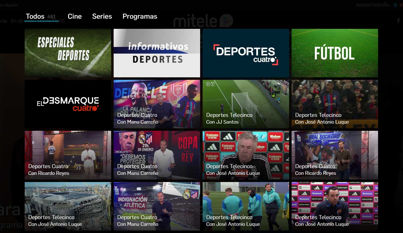 Mitele es la aplicación del servicio de streaming de Telecinco y Cuatro. Una app en la que puedes disfrutar de todos los partidos que se emitan en estas cadenas en abierto, así como de otros eventos deportivos. Puedes descargarte Mitele para Android y para iPhone.
