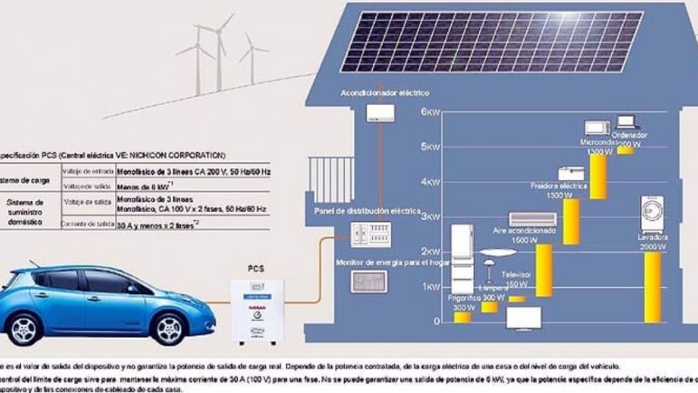 No se trata de que el coche eléctrico se cargue con la energía generada en paneles solares de nuestro hogar, sino de que la batería del coche se conecte al hogar para que proporcione electricidad a los aparatos electrónicos que necesitemos. El sistema ‘Vehicle to Home’ de Nissan acaba de presentarse en Barcelona en la feria Formula-e 2013. Este sistema de transferencia de energía conocido también como “LEAF to home” es una primicia en la industria del suministro eléctrico que permite suministrar electricidad a un hogar desde la batería durante dos días. Si hubiese un corte de electricidad el coche podría suministrar la energía.