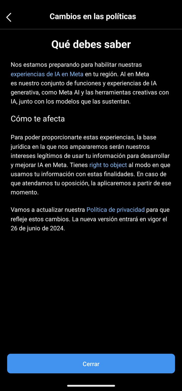 De hecho, la compañía ya está avisando por correo electrónico a sus usuarios sobre estos cambios. Sin embargo, los titulares de las cuentas de redes sociales pertenecientes a Meta podrán oponerse a estos cambios en el uso de la información privada, bien rellenando un formulario o entrando en la configuración de la cuenta.