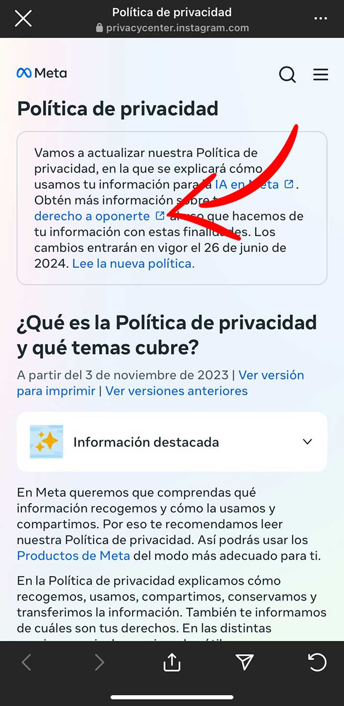 - Se abrirá el navegador con la información de Meta sobre su próxima actualización que te hemos detallado. En el primer recuadro, pincha en el enlace ‘derecho a oponerte’ para que Meta no use tus datos para alimentar su IA.