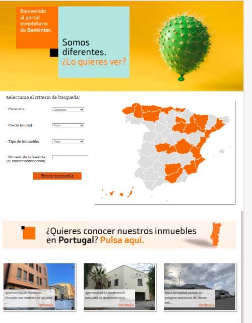 El portal inmobiliario de Bankinter es la entidad específica que gestiona los inmuebles propiedad de este banco. Se trata de una plataforma que catálogo de inmuebles de diversas tipologías que ofrece en régimen de venta a los usuarios. Desde casas, chalets y pisos, hasta áticos, locales, garajes y suelos. Los inmuebles a la venta de Bankinter están distribuidos por diferentes puntos de España.