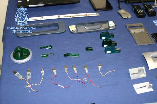 Agentes de Policía Nacional han detenido a los siete miembros de grupo organizado especializado en la confección de aparatos de skimmming para instalarlos en cajeros automáticos. 25 dispositivos han sido intervenidos y el laboratorio en el que clonaban las tarjetas bancarias ha sido desmantelado. El grupo ocultaba los dispositivos en cajeros automáticos para copiar los datos de las bandas magnéticas, datos que después volcaban en tarjetas vírgenes. Posteriormente estas tarjetas fraudulentas eran utilizadas para retirar pequeñas cantidades de efectivo o bien remitidas a Méjico donde eran empleadas para adquirir productos en establecimientos comerciales y venderlos en el mercado negro. Utilizaban un trastero en Madrid como taller de fabricación de los dispositivos de skimming y una vivienda también en la capital como centro de falsificación de las tarjetas de crédito.